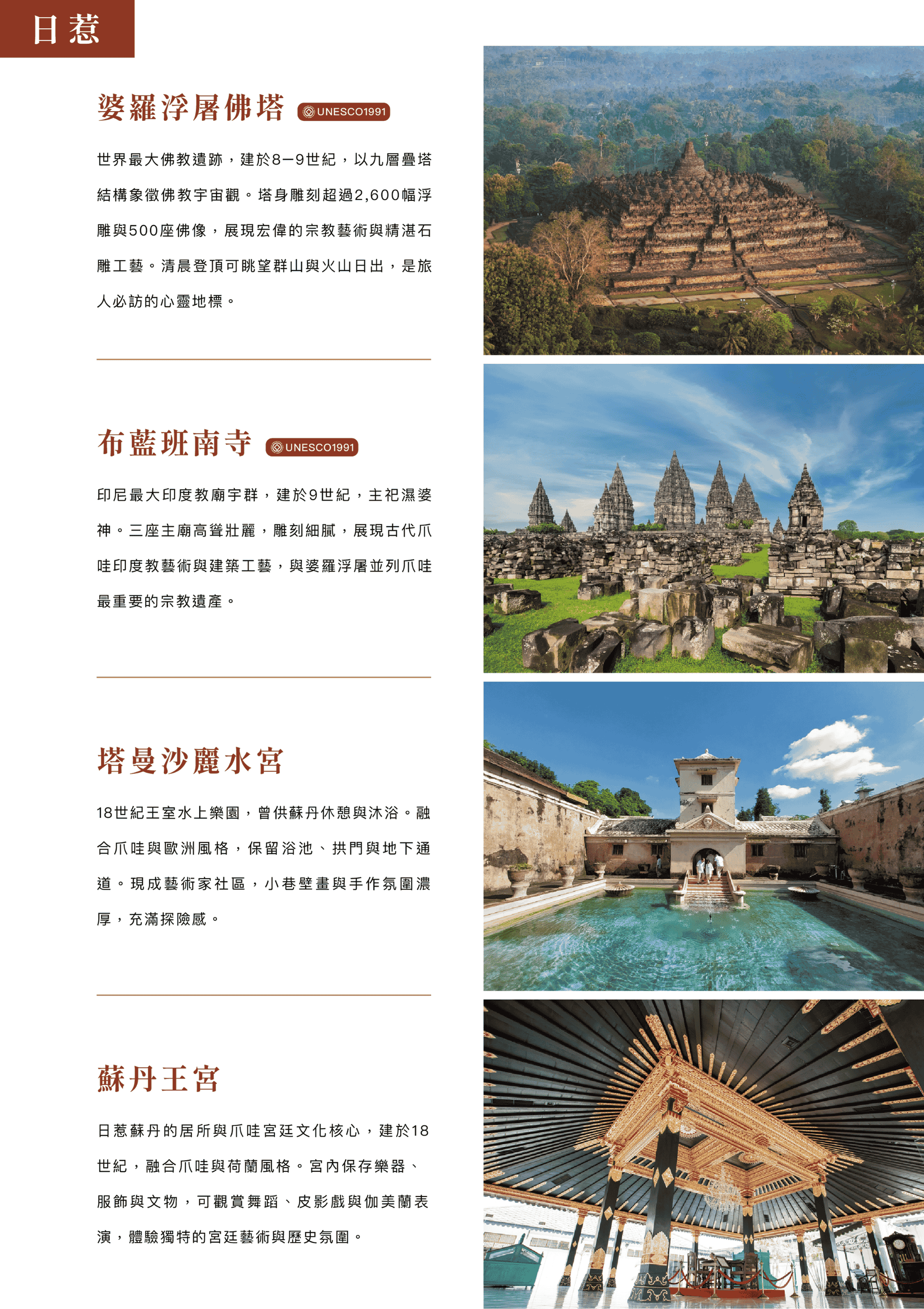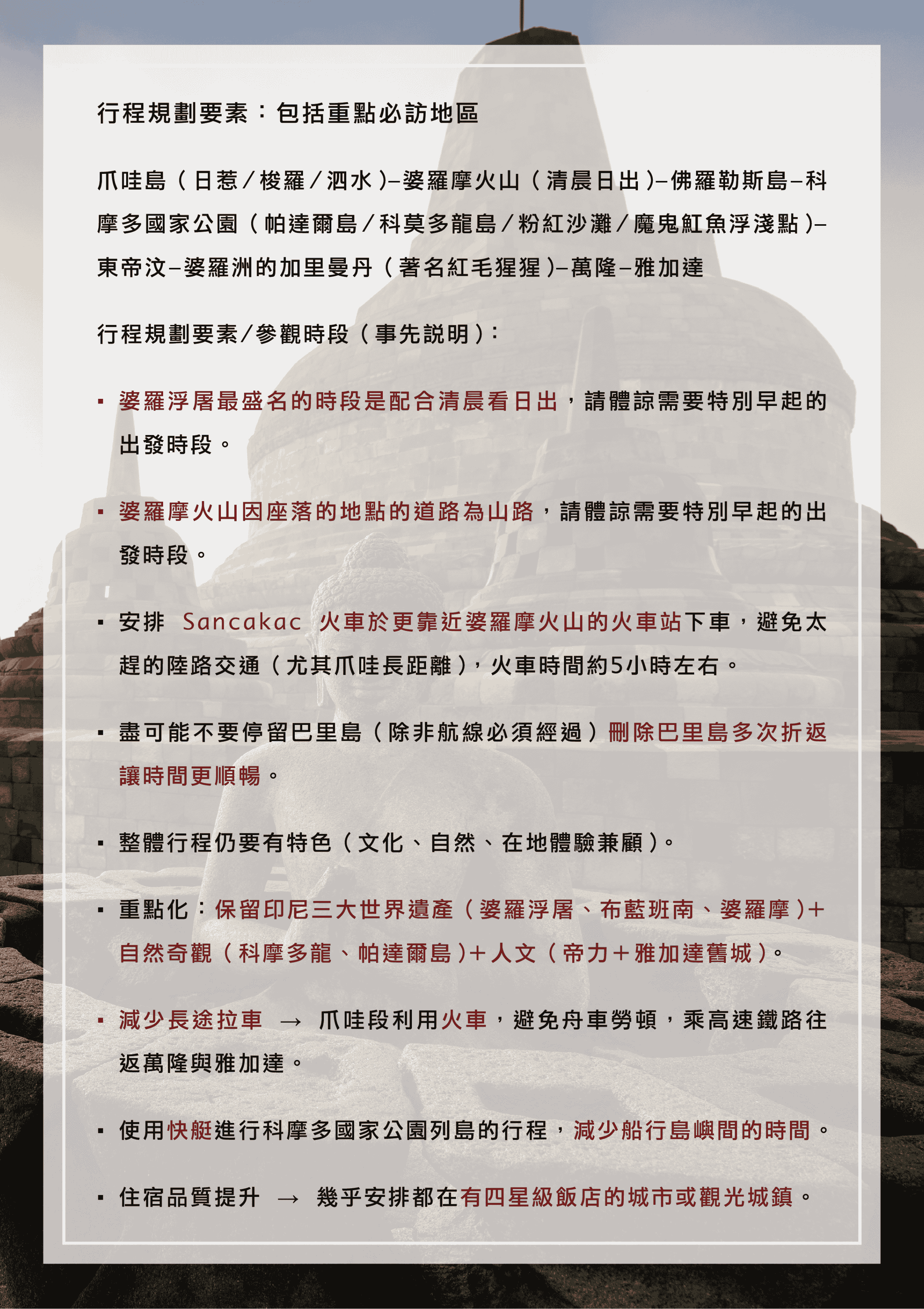 重點化:保留印尼三大世界遺產(婆羅浮屠、布藍班南、婆羅摩)+自然奇觀(科摩多龍、帕達爾島)+人文(帝力+雅加達舊城)。