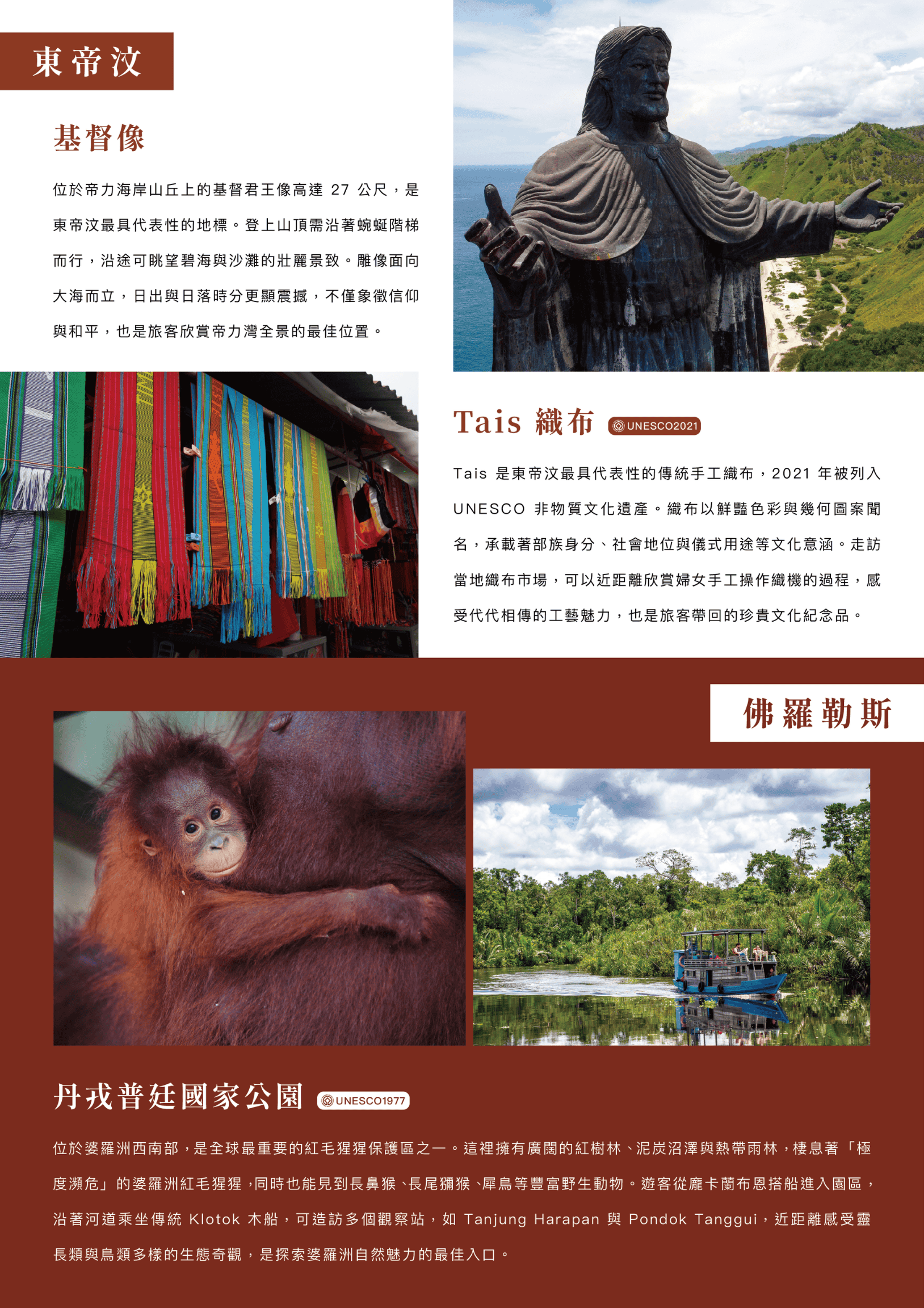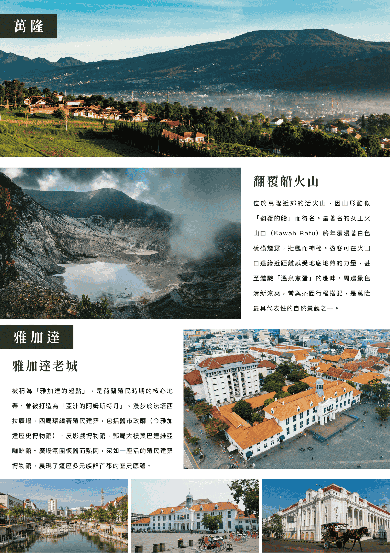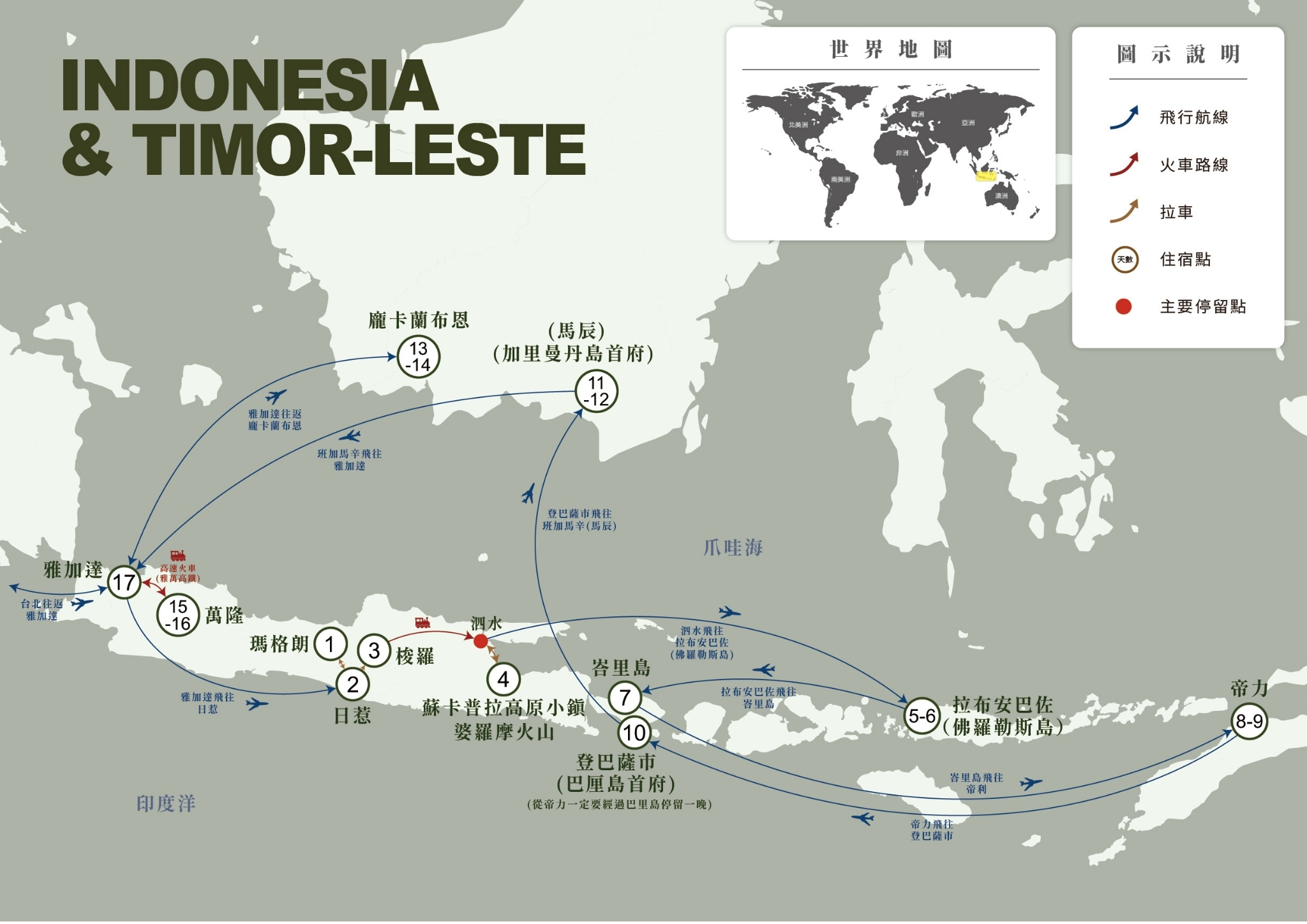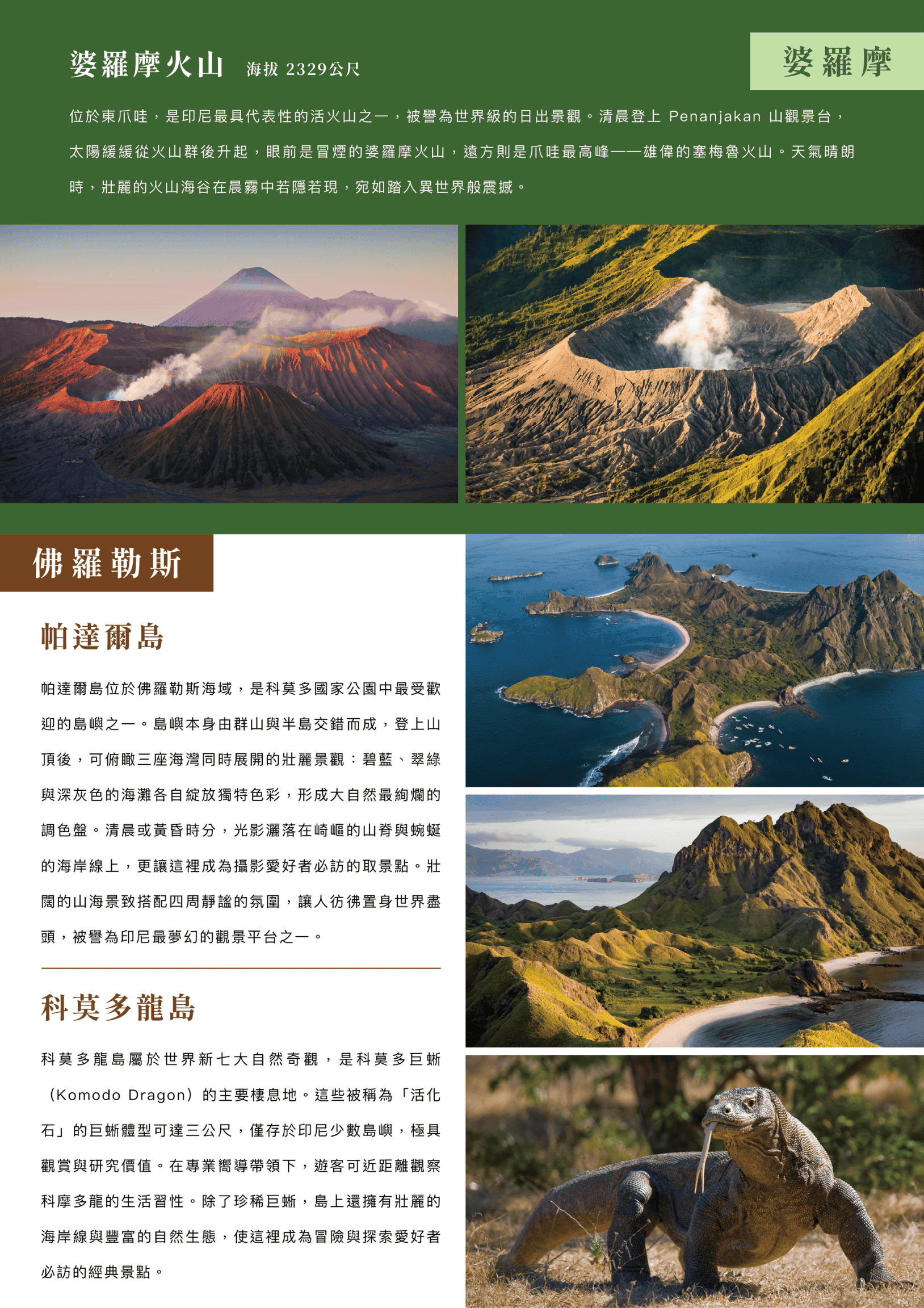 包括重點必訪地區 爪哇島(日惹/梭羅/泗水)— 婆羅摩火山(清晨日出)— 佛羅勒斯島—科摩多國家公園(帕達爾島/科莫多龍島/粉紅沙灘/魔鬼魟魚浮淺點)— 東帝汶—婆羅洲的加里曼丹(著名紅毛猩猩)— 萬隆— 雅加達