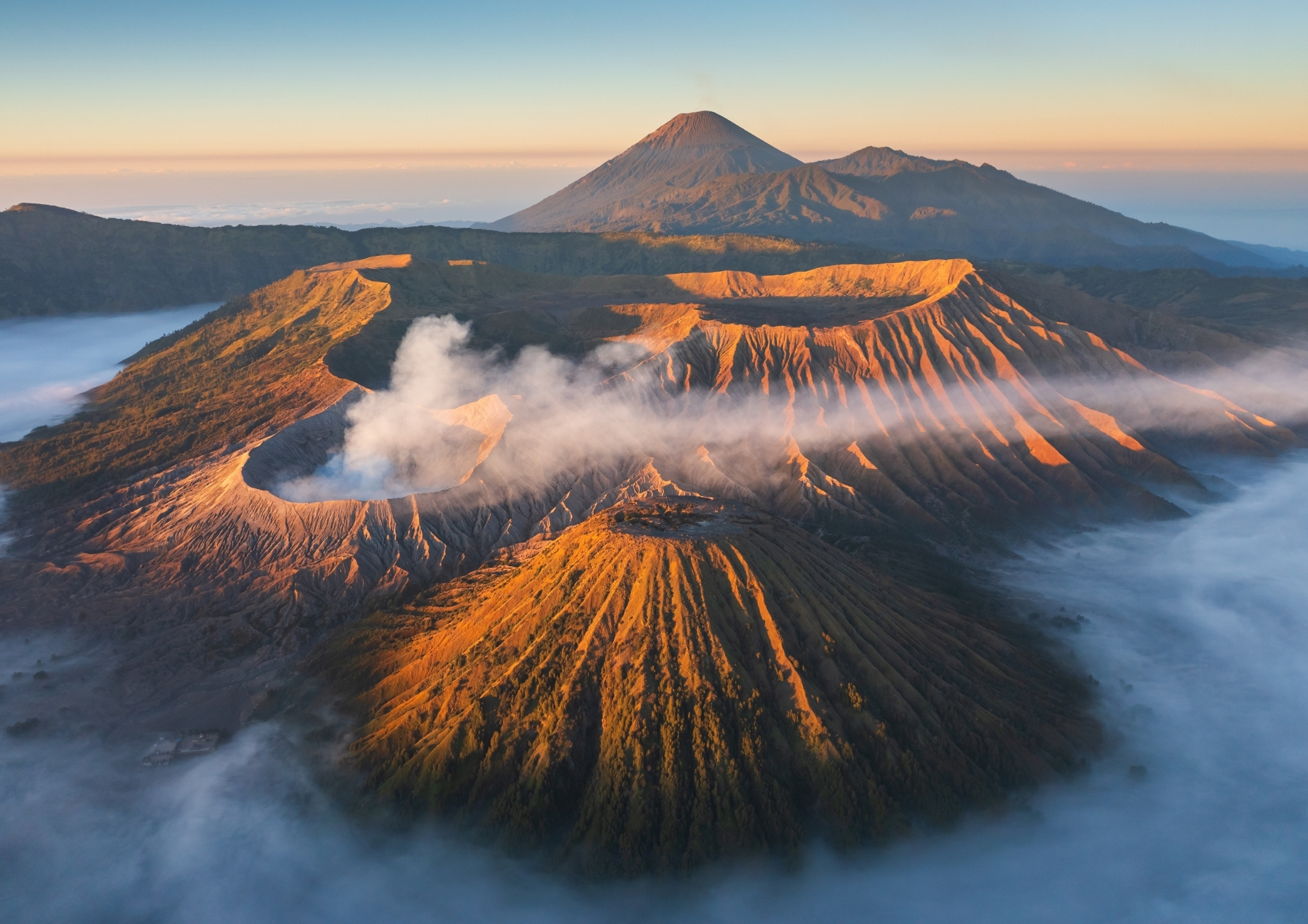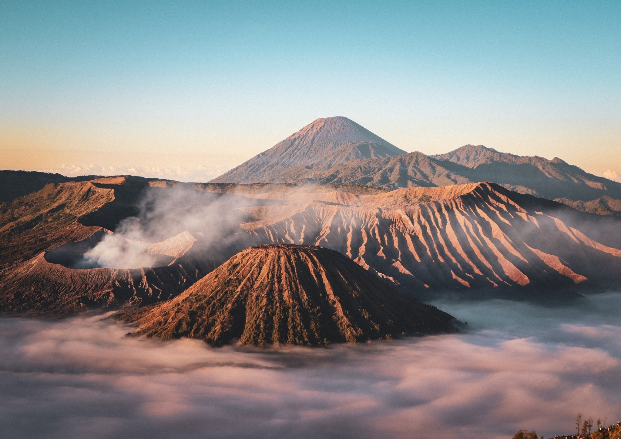 位於東爪哇,是印尼最具代表性的活火山之一,被譽為世界級的日出景觀。清晨登上 Penanjakan 山觀景台,太陽緩緩從火山群後升起,眼前是冒煙的婆羅摩火山,遠方則是爪哇最高峰——雄偉的塞梅魯火山。天氣晴朗時,壯麗的火山海谷在晨霧中若隱若現,宛如踏入異世界般震撼。