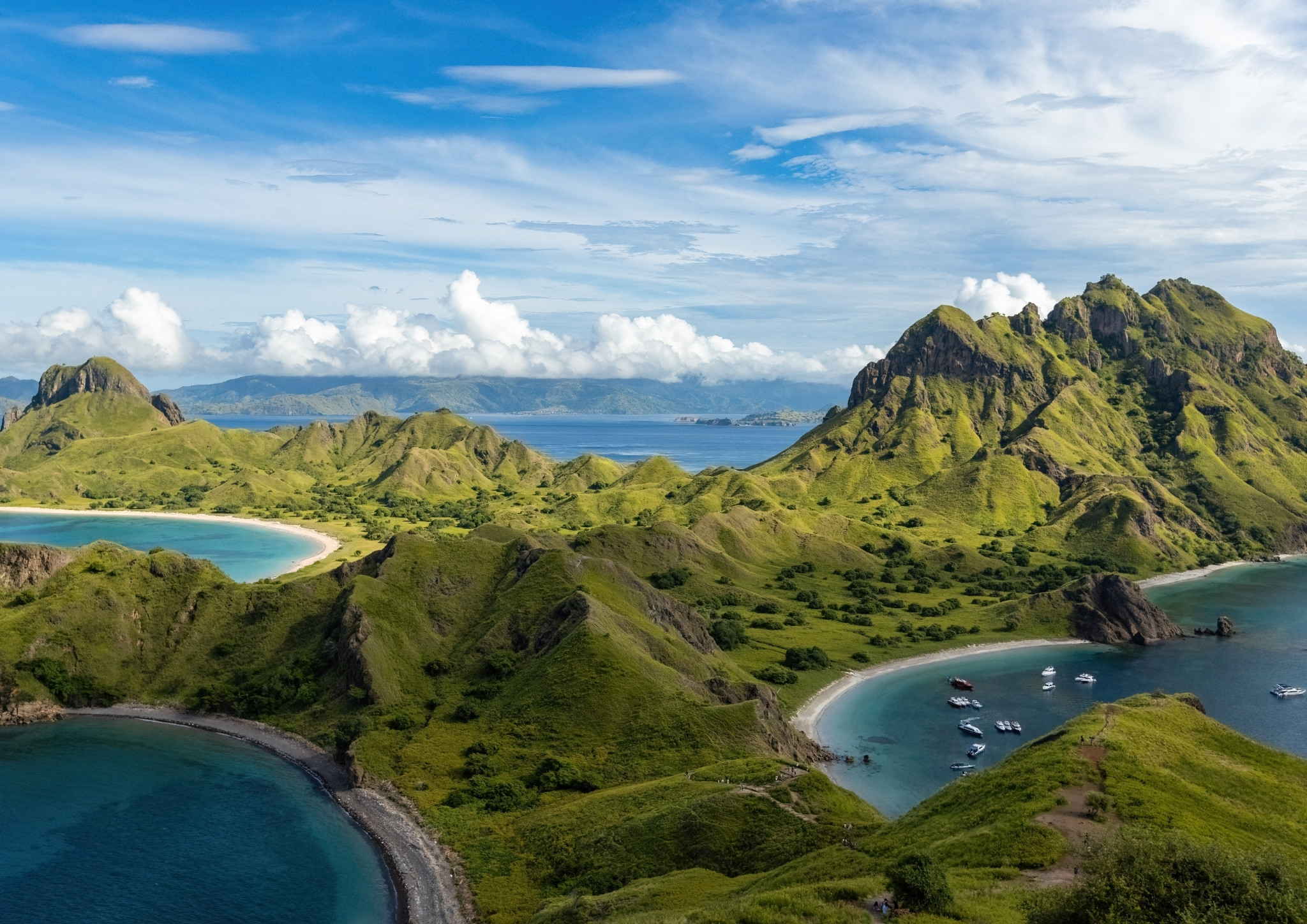 帕達爾島位於佛羅勒斯海域,是科莫多國家公園中最受歡迎的島嶼之一。島嶼本身由群山與半島交錯而成,登上山頂後,可俯瞰三座海灣同時展開的壯麗景觀:碧藍、翠綠與深灰色的海灘各自綻放獨特色彩,形成大自然最絢爛的調色盤。清晨或黃昏時分,光影灑落在崎嶇的山脊與蜿蜒的海岸線上,更讓這裡成為攝影愛好者必訪的取景點。壯闊的山海景致搭配四周靜謐的氛圍,讓人彷彿置身世界盡頭,被譽為印尼最夢幻的觀景平台之一。