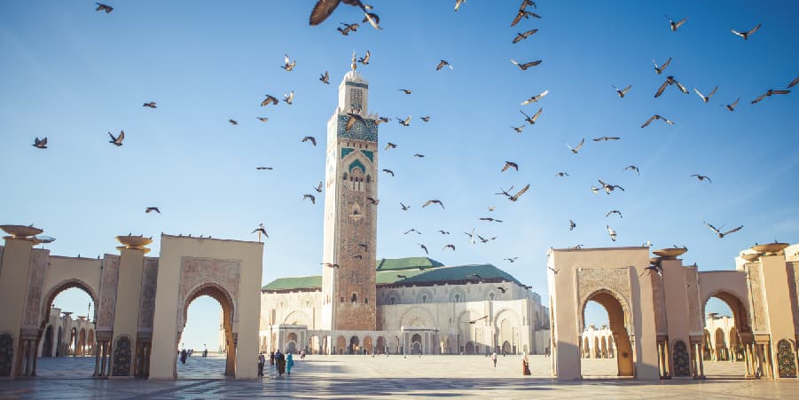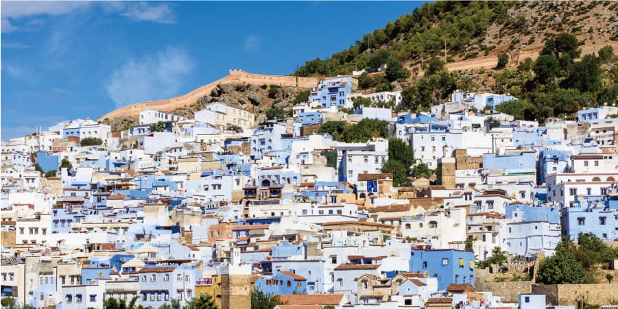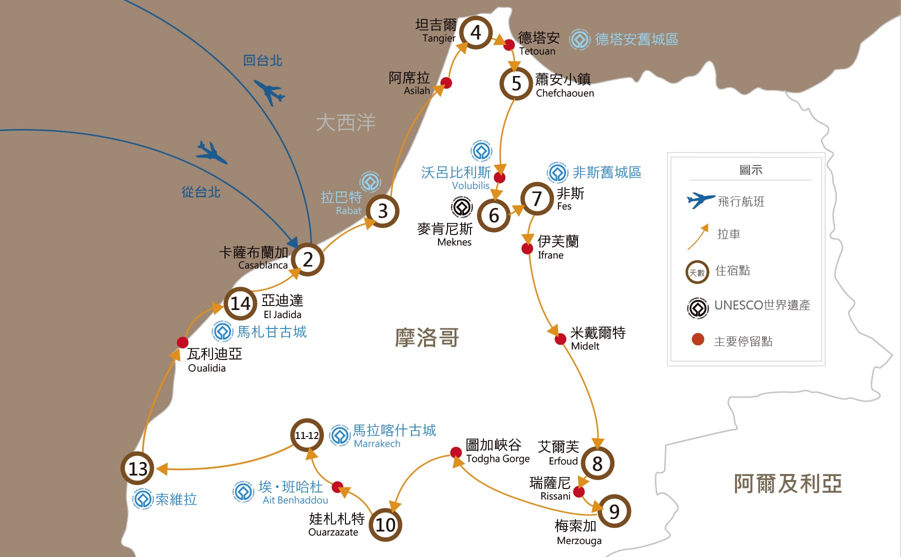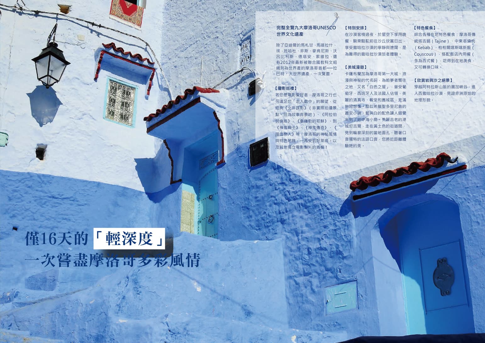 卡薩布蘭加為摩洛哥第一大城、浪漫與神秘的代名詞,為追夢者嚮往之地,又名「白色之屋」,曾受葡萄牙、西班牙人及法國人佔領,美麗的清真寺、教堂和舊城區,充滿無限想像。酷似希臘聖多里尼島的蕭安小鎮,藍與白的配色讓人錯覺來到了地中海小島。美麗古老的港城坦吉爾,走在黃土色的街道間、見到輪廓深刻的當地面孔、聽著口音獨特的法語口音,您將近距離體驗她的美。
