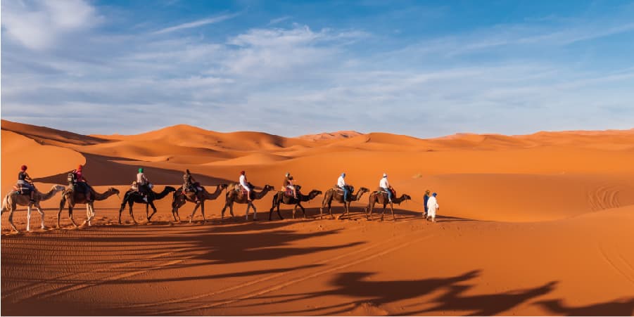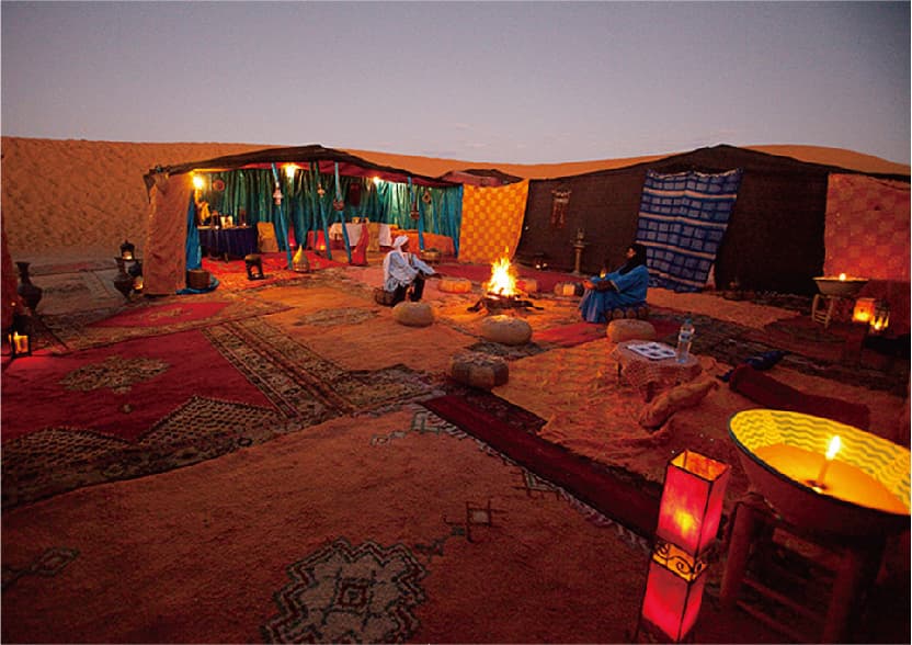 在沙漠客棧過夜、於星空下享用晚餐、騎乘駱駝前往沙丘欣賞日出,享受撒哈拉沙漠的寧靜與遼闊,是為難得的撒哈拉沙漠旅者體驗。
