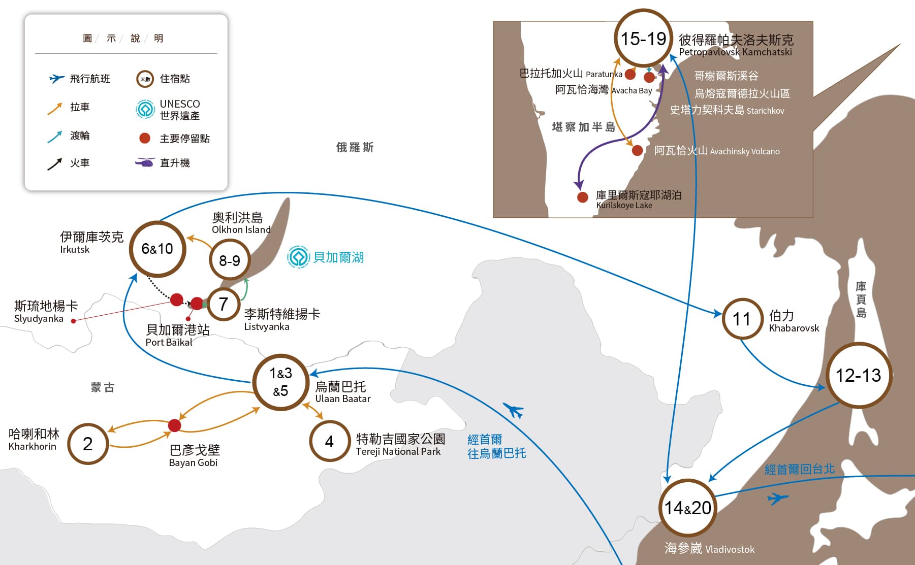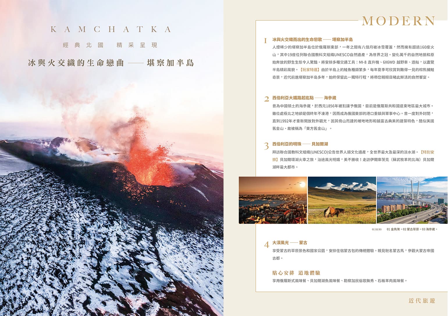 人煙稀少的堪察加半島位於俄羅斯東部,一年之間有八個月被冰雪覆蓋,然而擁有超過160座火山,其中19座位列聯合國教科文組織UNESCO自然遺產,為世界之冠。變化萬千的自然地貌和原始奔放的野生生態令人驚豔。將安排多種交通工具:MI-8直升機、6X6WD越野車、遊船,以盡覽半島精彩風貌。