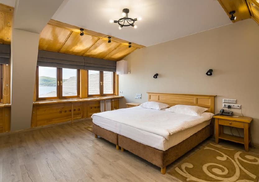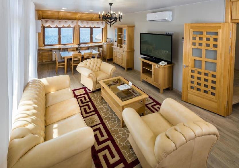 酒店的舒適客房均配有意大利橡木家具、有線電視和私人浴室,部分客房設有陽台及無線網絡連接。每天早晨供應歐陸式早餐。餐廳享有貝加爾湖的美景。設有台球室,還提供貝加爾湖區的釣魚和划船等活動。貝加爾湖博物館距離酒店有1.5公里,擁有貝加爾湖海豹的水族館。酒店位置便利,為客人提供每個季節的全方位戶外活動。其中一些活動是釣魚,在貝加爾湖上巡航,雪地摩托,騎馬,滑雪等。