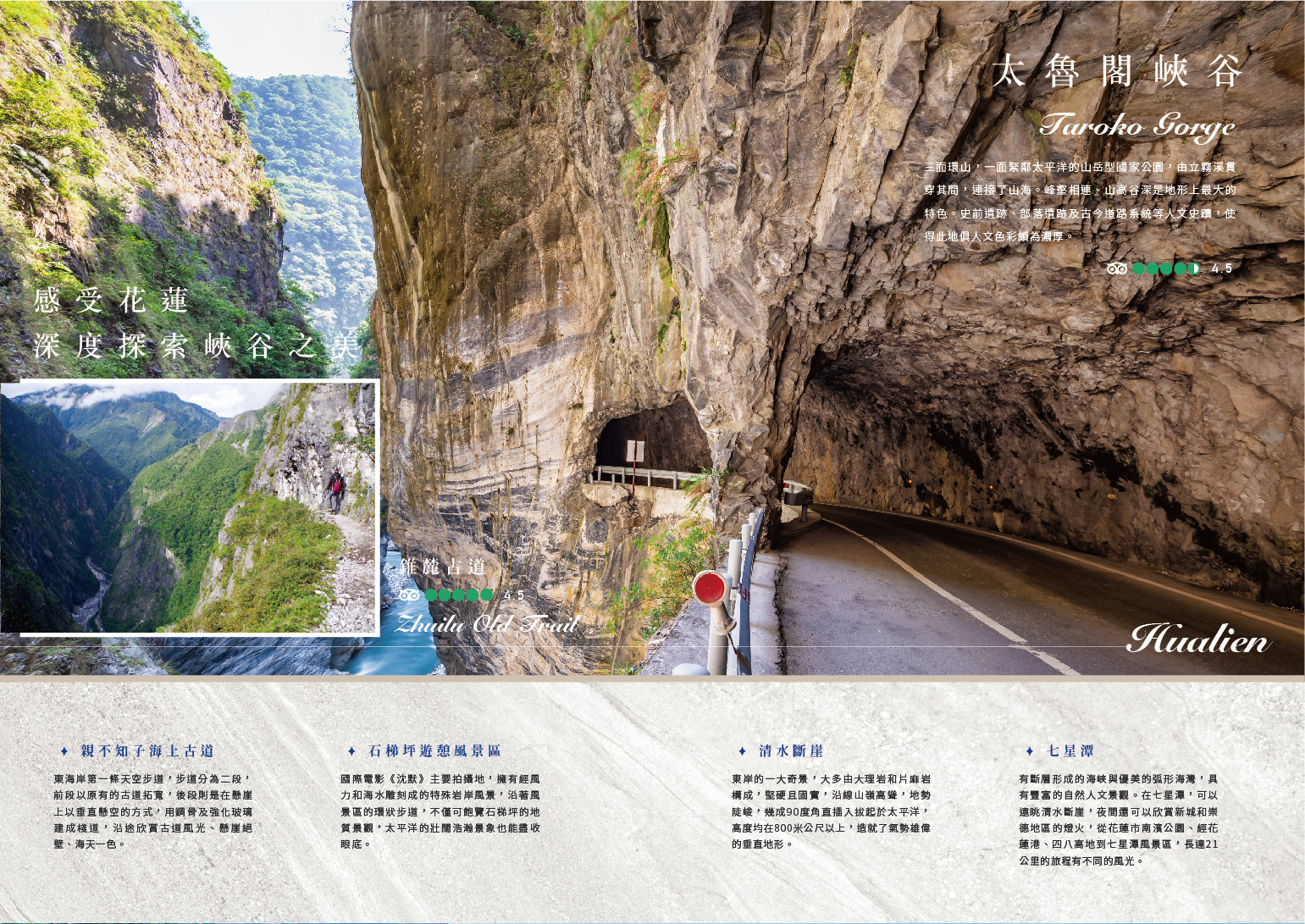 三面環山,一面緊鄰太平洋的山岳型國家公園,由立霧溪貫穿其間,連接了山海。峰壑相連、山高谷深是地形上最大的特色。史前遺跡、部落遺跡及古今道路系統等人文史蹟,使得此地俱人文色彩頗為濃厚。