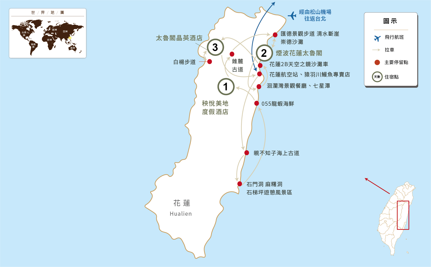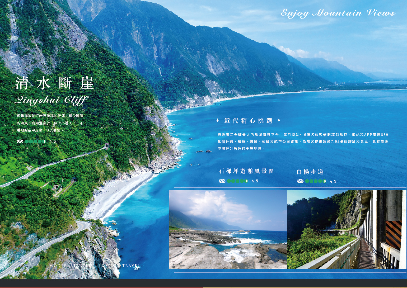座落於山海交會處,鄰近花蓮太魯閣國家公園與湛藍無垠的太平洋,設計的構思走高端不冷硬的現代簡約風格,沉穩內斂的裝潢與得天獨厚的山海美景。