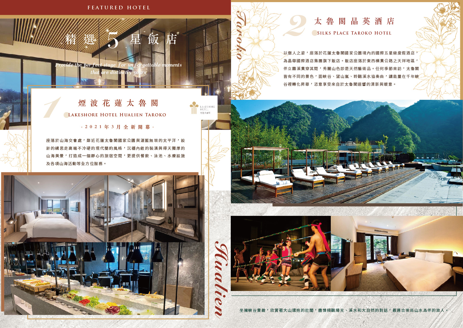以傲人之姿,座落於花蓮太魯閣國家公園境內的國際五星級度假酒店,為晶華國際酒店集團旗下飯店。飯店座落於東西橫貫公路之天祥地區,伴立霧溪貫穿其間,秀麗山色即是天然藝術品。任何季節來訪,太魯閣皆有不同的景色,面峽谷、望山嵐、聆聽溪水協奏曲,讓能量在千年峽谷裡轉化昇華,恣意享受來自於太魯閣迴響的清新與暖意。