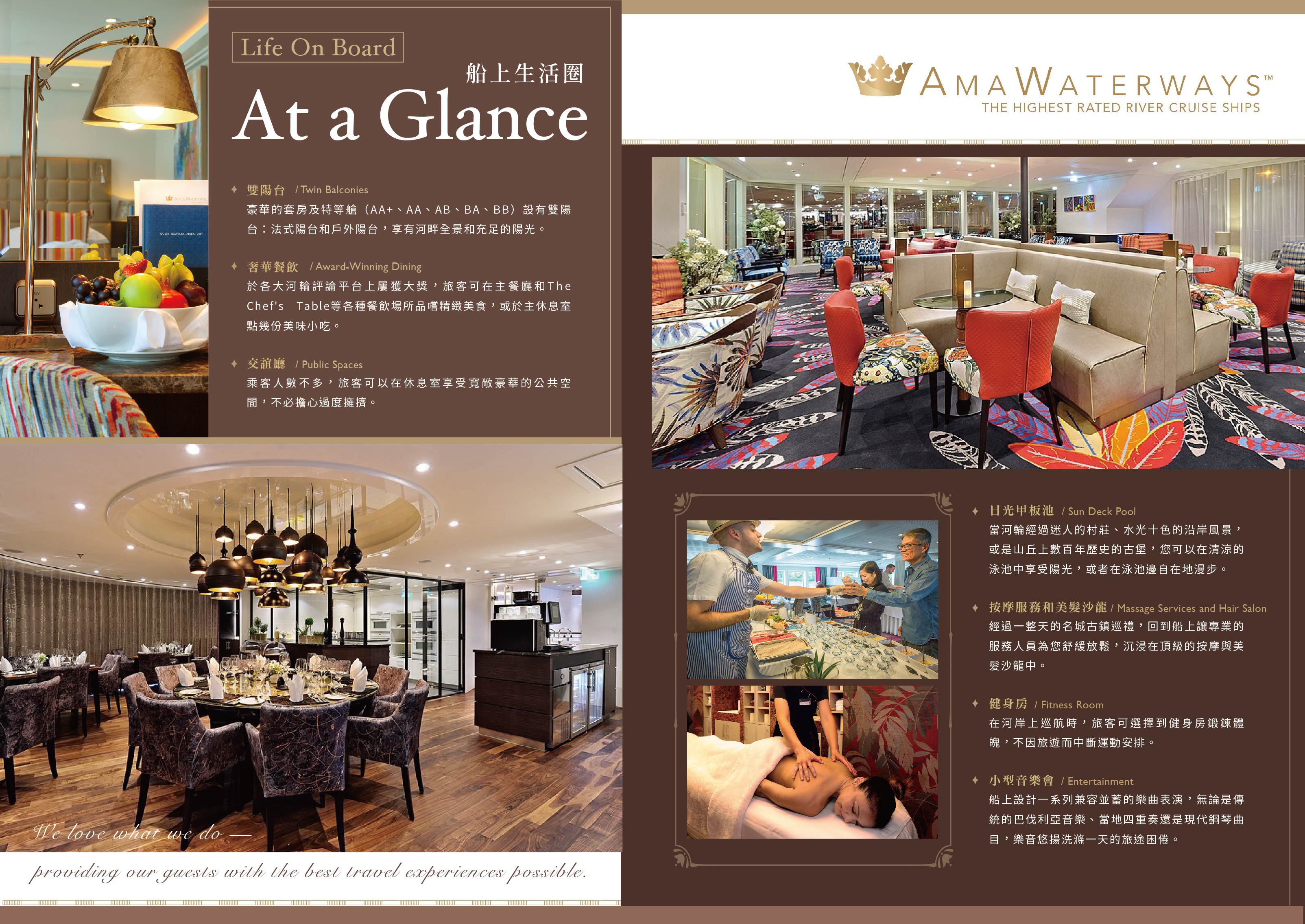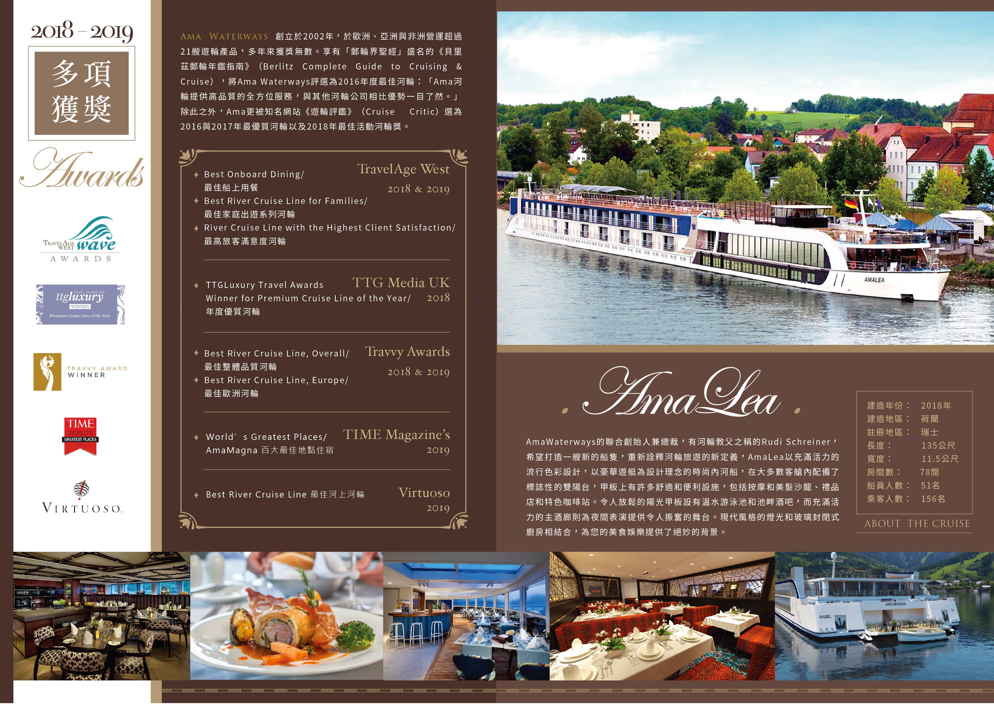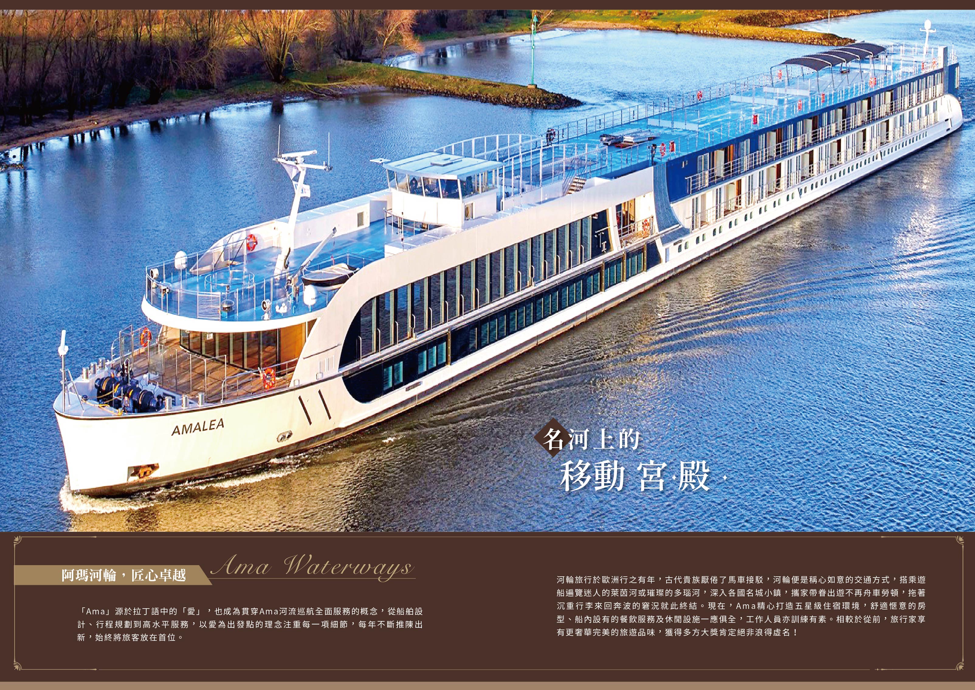 AmaWaterways的聯合創始人兼總裁,有河輪教父之稱的Rudi Schreiner,希望打造一艘新的船隻,重新詮釋河輪旅遊的新定義,AmaLea以充滿活力的流行色彩設計,以豪華遊艇為設計理念的時尚內河船,在大多數客艙內配備了標誌性的雙陽台,甲板上有許多舒適和便利設施,包括按摩和美髮沙龍、禮品店和特色咖啡站。令人放鬆的陽光甲板設有溫水游泳池和池畔酒吧,而充滿活力的主酒廊則為夜間表演提供令人振奮的舞台。現代風格的燈光和玻璃封閉式廚房相結合,為您的美食娛樂提供了絕妙的背景。