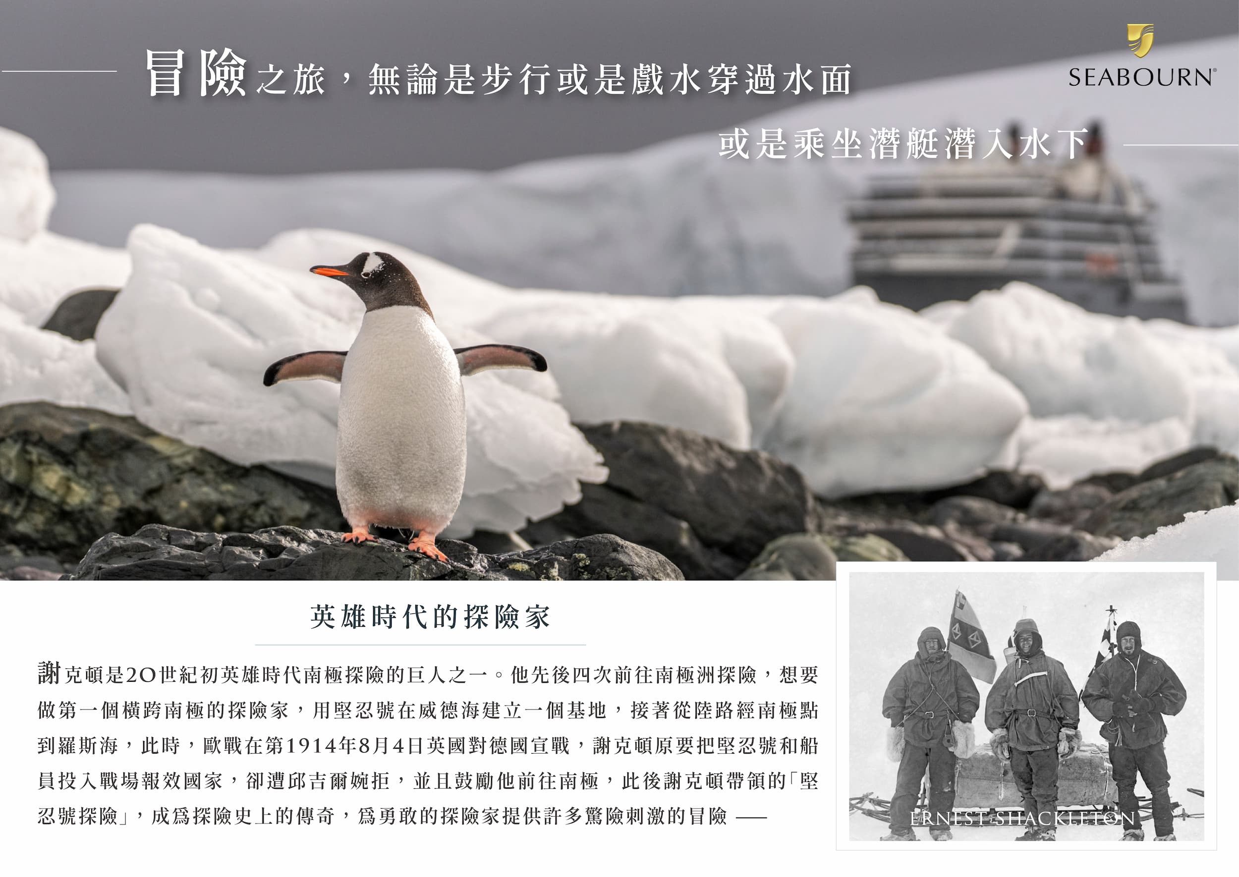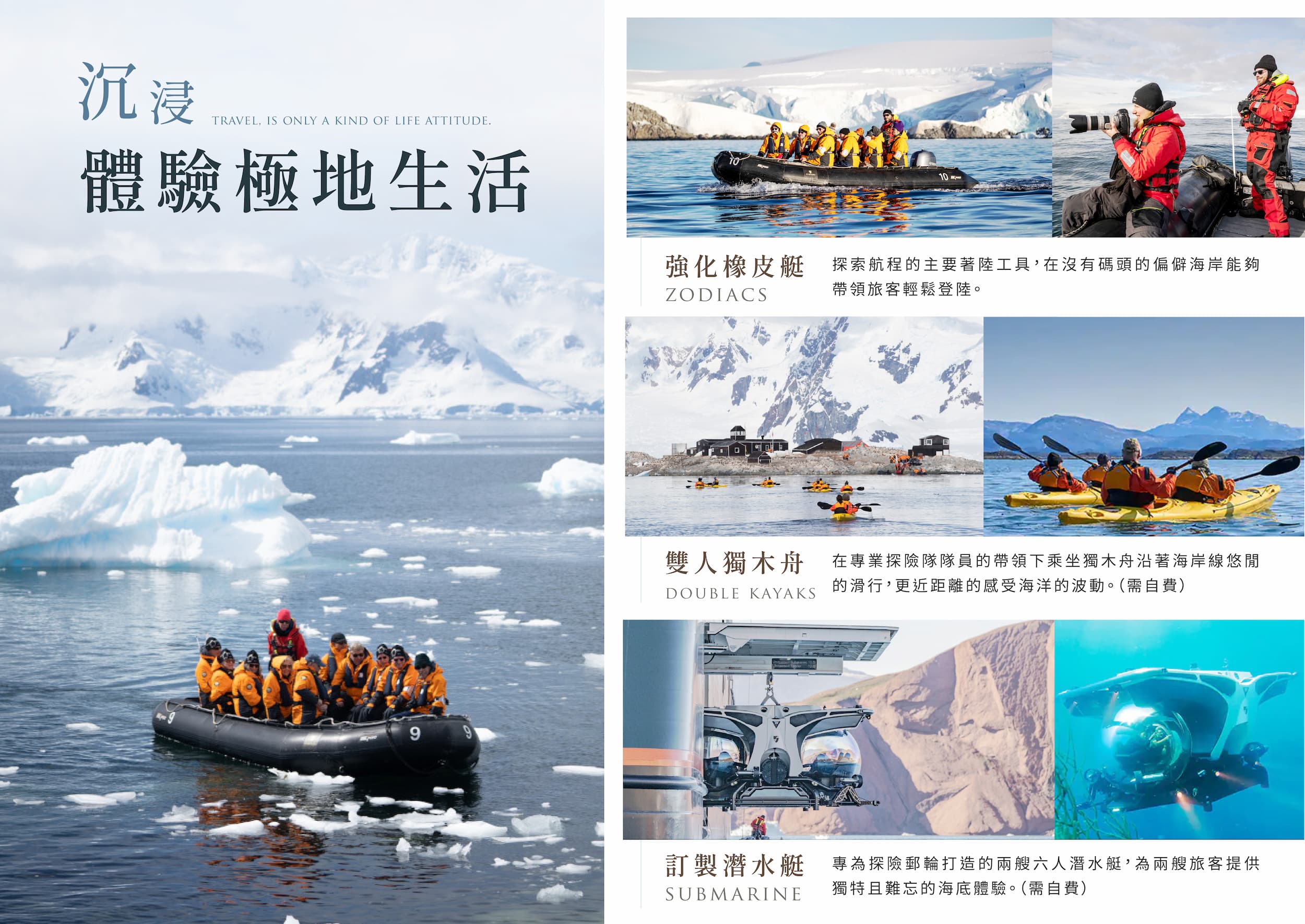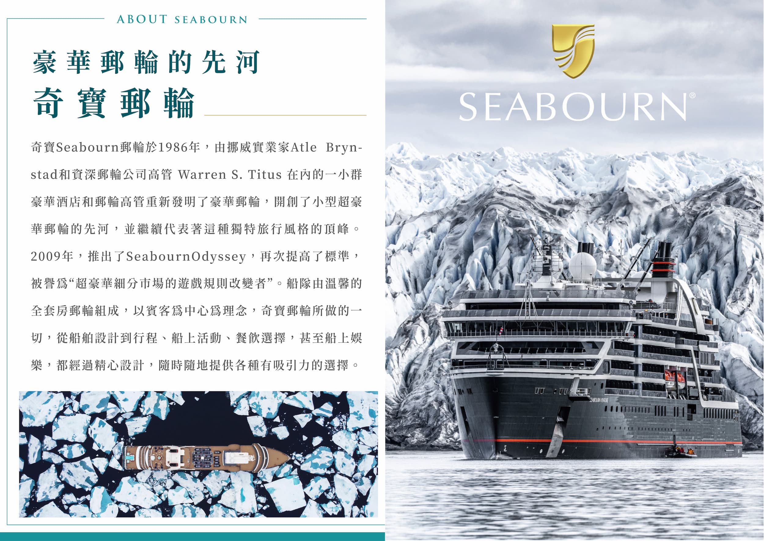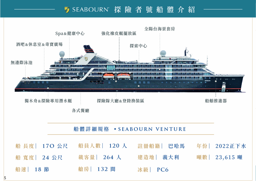 Seabourn Pursuit屬於最新的探險船,這艘船以最高水平的豪華、安全和可持續發展的方式駛向世界未知的領域。該船是專門為偏遠、特殊環境建造的,可讓您探索大船無法到達的地方,符合PC6極地級標準,並配備了先進的硬件和技術。Seabourn Pursuit 擁有兩艘特製潛艇、24艘 Zodiac強化橡皮艇、皮划艇和一支26人的專家探險隊,負責在航行中照顧客人。除了船上水療中心和夜間娛樂等奢華設施外,Seabourn Pursuit 的設計將堅固的探險船所需要的實際需求與空間和海洋景觀無縫地融合在一起,讓客人能夠與前往的目的地建立聯繫。