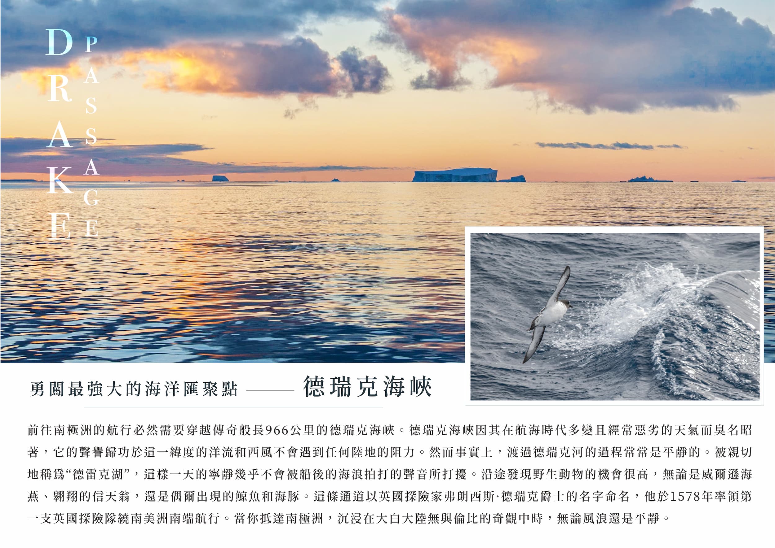 前往南極洲的航行必然需要穿越傳奇般長966公里的德瑞克海峽。德瑞克海峽因其在航海時代多變且經常惡劣的天氣而臭名昭著,它的聲譽歸功於這一緯度的洋流和西風不會遇到任何陸地的阻力。然而事實上,渡過德瑞克河的過程常常是平靜的。被親切地稱為“德雷克湖”,這樣一天的寧靜幾乎不會被船後的海浪拍打的聲音所打擾。沿途發現野生動物的機會很高,無論是威爾遜海燕、翱翔的信天翁,還是偶爾出現的鯨魚和海豚。