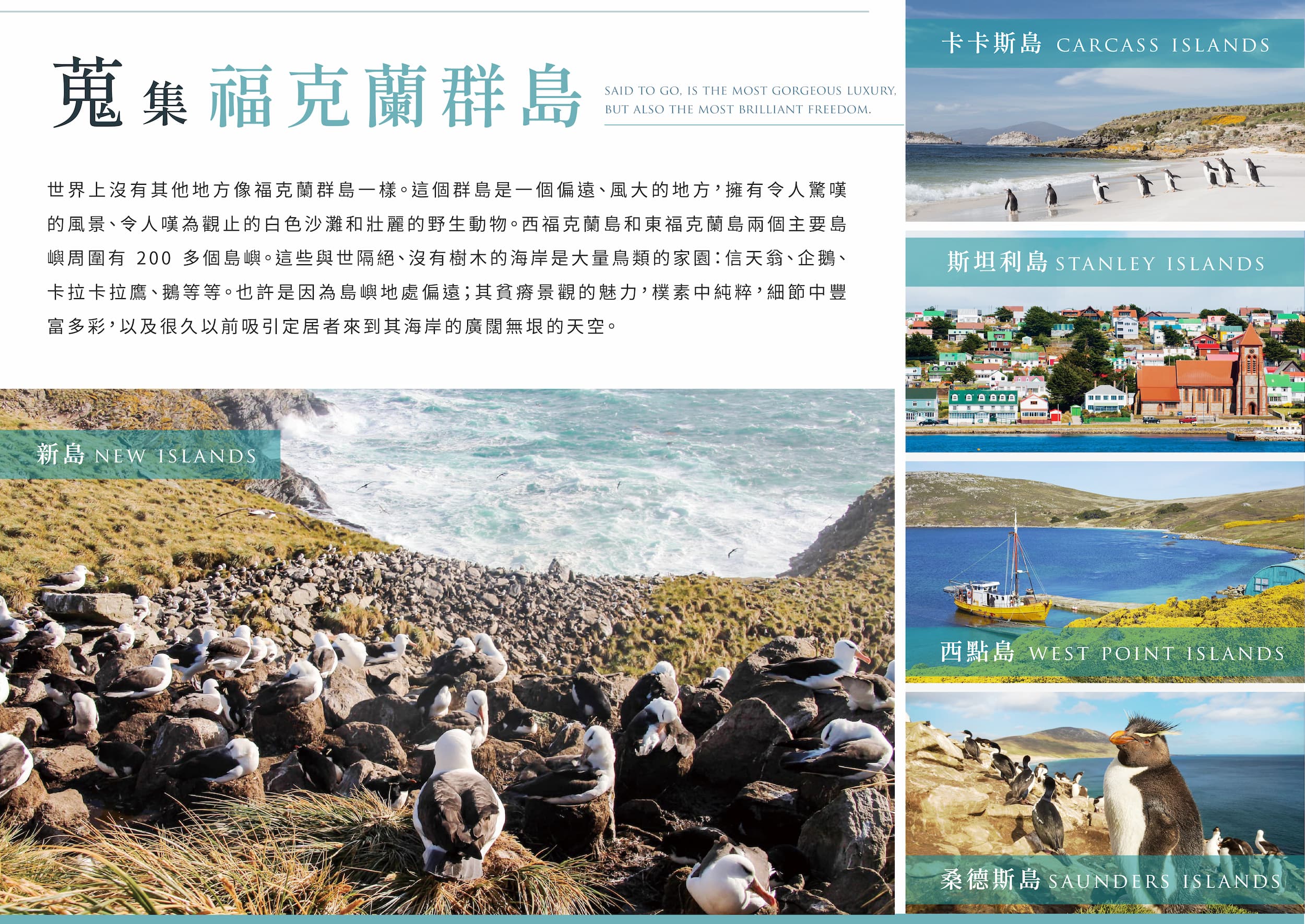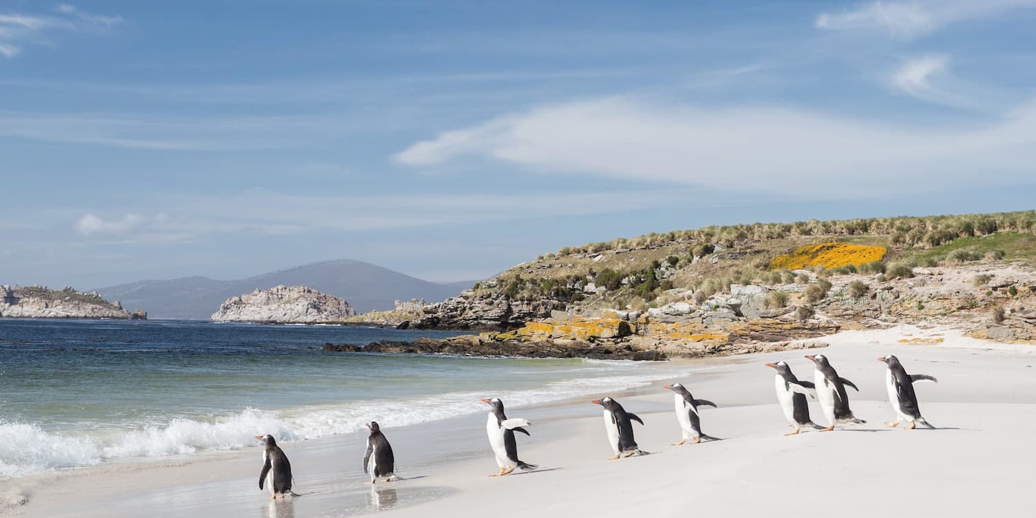 世界上沒有其他地方像福克蘭群島一樣。這個群島是一個偏遠、風大的地方,擁有令人驚嘆的風景、令人嘆為觀止的白色沙灘和壯麗的野生動物。西福克蘭島和東福克蘭島兩個主要島嶼周圍有 200 多個島嶼。這些與世隔絕、沒有樹木的海岸是大量鳥類的家園:信天翁、企鵝、卡拉卡拉鷹、鵝等等。也許是因為島嶼地處偏遠;其貧瘠景觀的魅力,樸素中純粹,細節中豐富多彩,以及很久以前吸引定居者來到其海岸的廣闊無垠的天空。