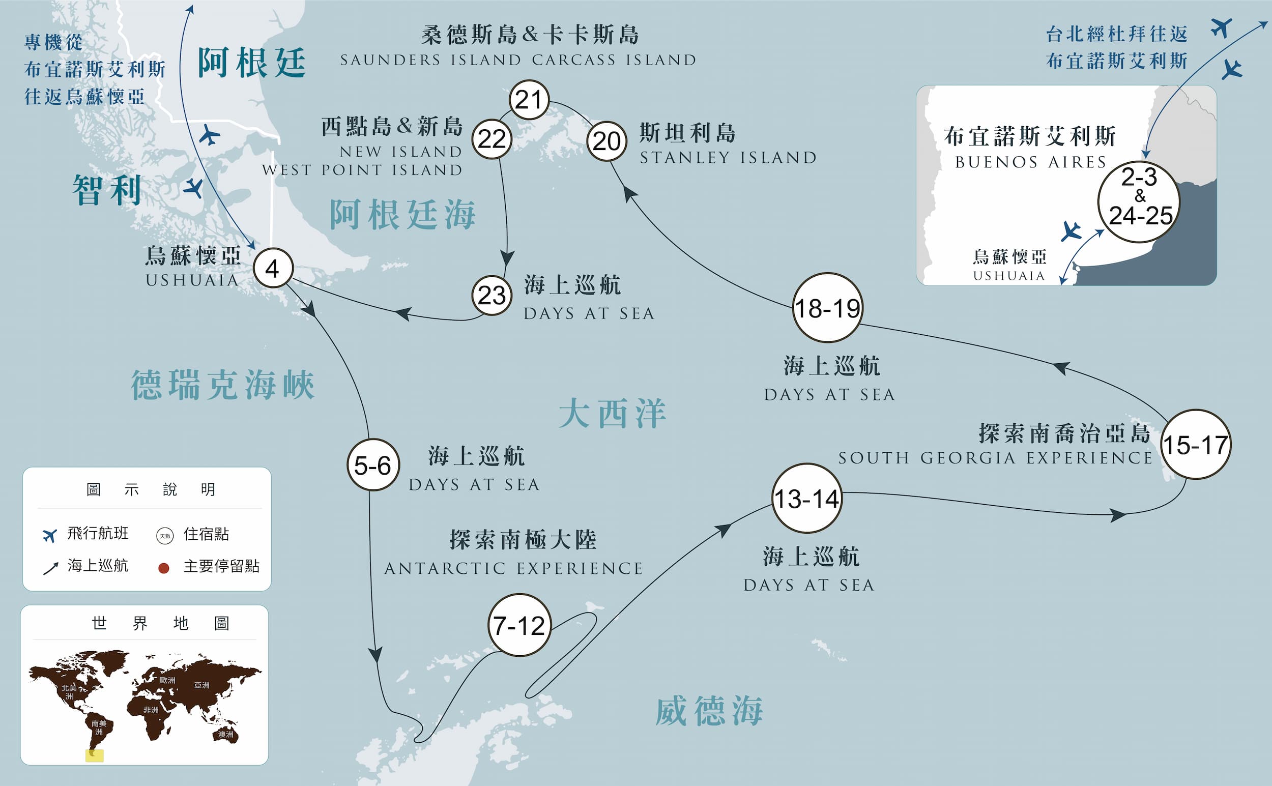 南設得蘭群島是一連串偏遠的孤立火山島,與南極半島相隔120公里,它們是南極洲之旅非常值得前往的亮點之一,群島冰川覆蓋嚴重,由於氣候較為溫和,經常隱藏在薄霧中。這些島嶼提供了許多上岸探索的機會。前捕鯨時代的歷史遺跡、現代研究站、不尋常的地質構造、火山活動的證據以及數量巨大的企鵝棲息地,使南設得蘭群島成為通往白色大陸的獨特前哨基地。