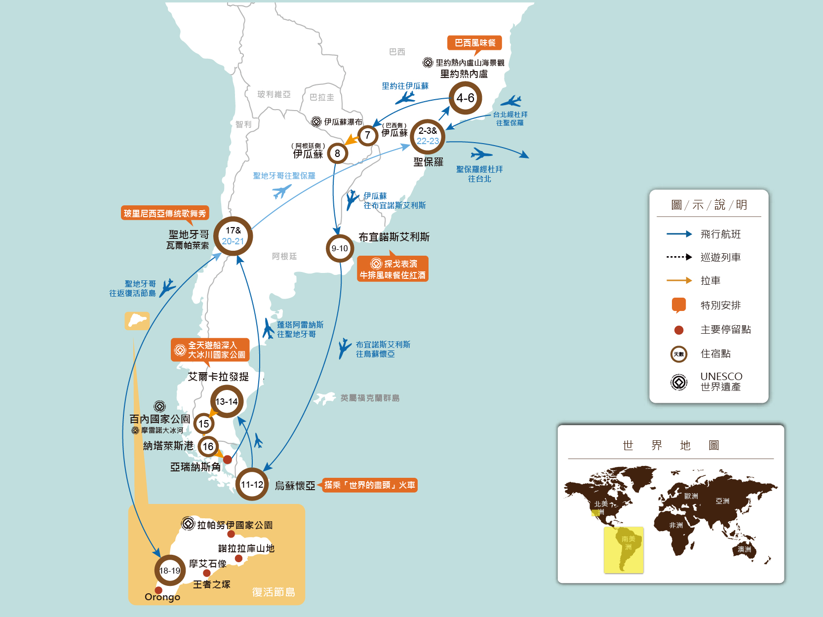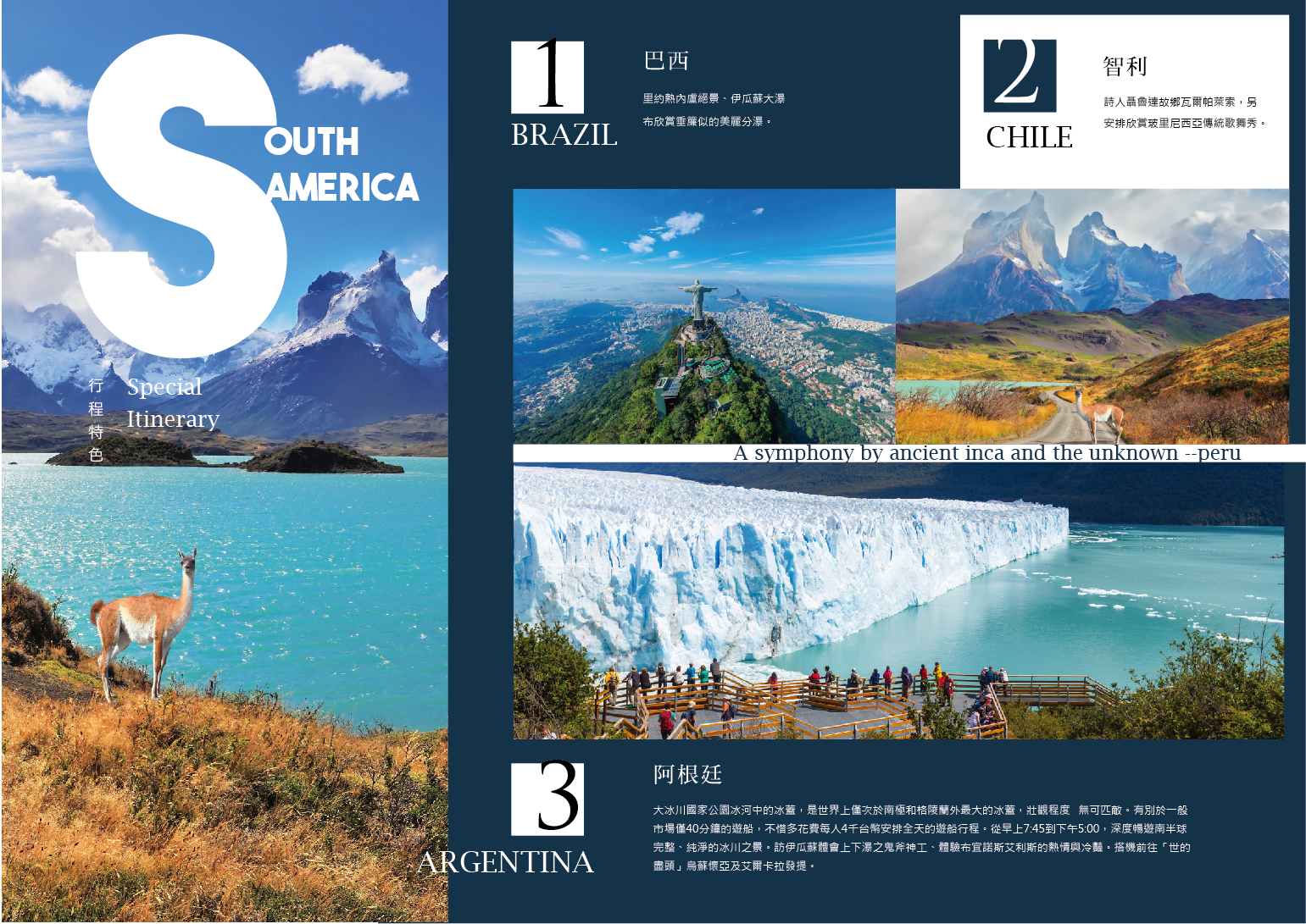 大冰川國家公園(UNESCO 1981)是除南極大冰川、格陵蘭大冰川之後,全球第三大冰川區,冰川為極地以外最大型之一,由47個大小冰川組成。安地斯山脈的積雪,經年累月形成巍然聳立冰河,其緩慢流動所造成的冰壁碎裂巨響,是造物者的低鳴。
