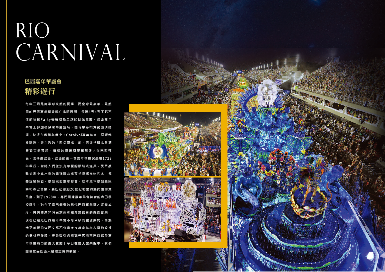 每年二月是南半球炎熱的夏季,而全球最豪華、最熱鬧的巴西嘉年華會就在此時展開,長達4天4夜不眠不休的狂歡Party每每成為全球的目光焦點,巴西嘉年華會上參加者穿著華麗盛裝,隨音樂節拍舞動盡情搖擺,沈浸在歡樂氣氛中!
