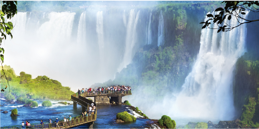 巴西境內的伊瓜蘇瀑布(UNESCO 1986),在巴西部份沿著2.6公里的生態步道,步道的盡頭就是「巴西的魔鬼咽喉」,在此您可以看到大量的河水奔騰宣洩而下,激起了濃烈的水氣,並伴隨著轟隆巨響,當地的印地安人還把它形容成「入地獄之海」。