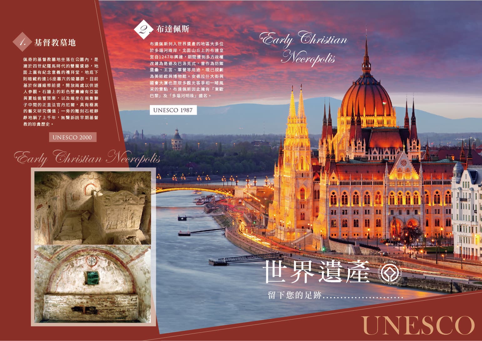 布達佩斯列入世界遺產的地區大多位於多瑙河兩岸,北面山丘上的布達皇宮自1247年興建,期間遭到多方政權改建為哥德及巴洛克式,曾作為防禦堡壘、王宮、軍營等用途,現已規劃為美術館與博物館。安德拉什大街與國會大廈也是眾多觀光客爭相一睹風采的景點,布達佩斯因此擁有「東歐巴黎」及「多瑙河明珠」盛名。