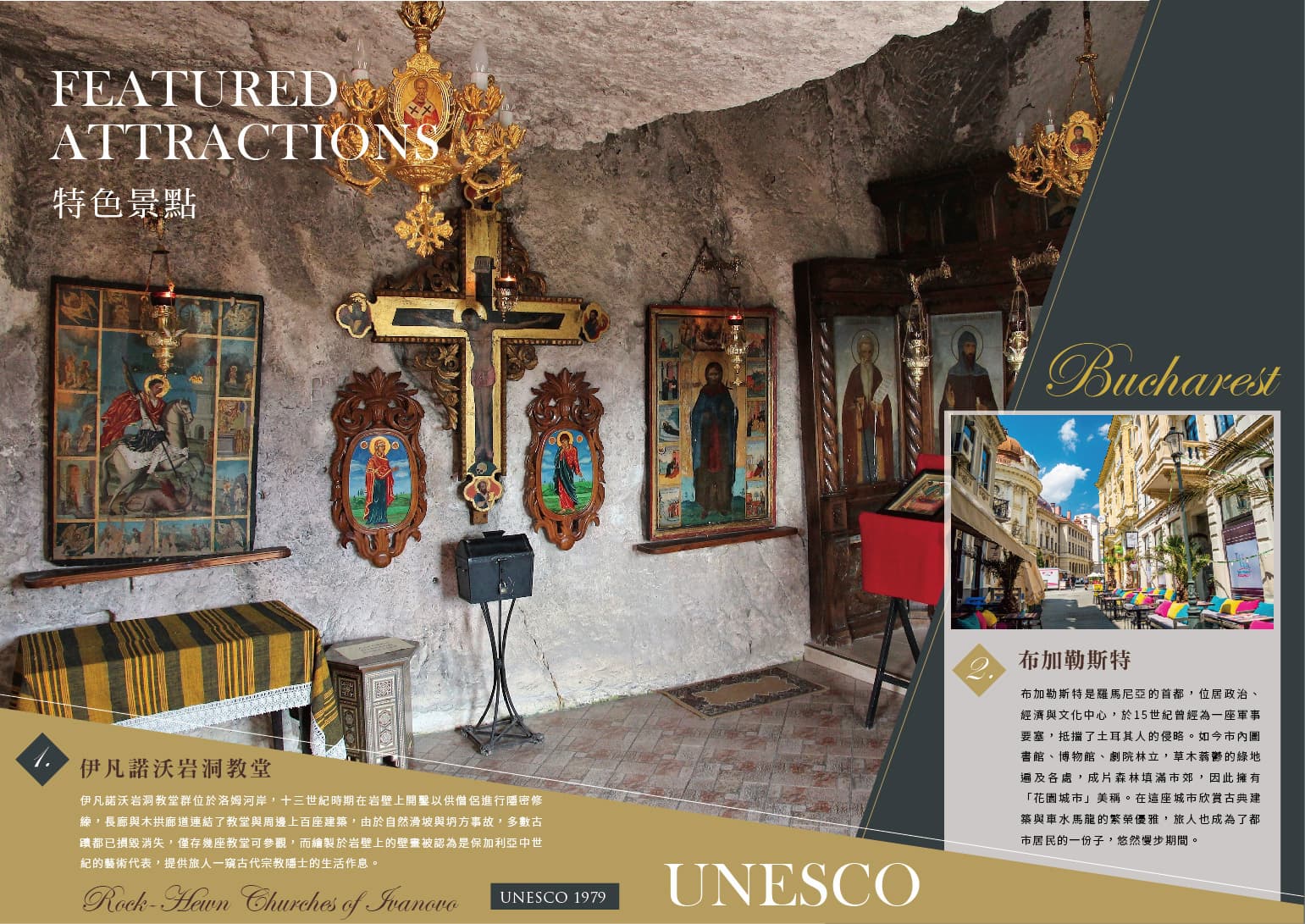 布加勒斯特是羅馬尼亞的首都,位居政治、經濟與文化中心,於1 5 世紀曾經為一座軍事要塞,抵擋了土耳其人的侵略。如今市內圖書館、博物館、劇院林立,草木蓊鬱的綠地遍及各處,成片森林填滿市郊,因此擁有「花園城市」美稱。在這座城市欣賞古典建築與車水馬龍的繁榮優雅,旅人也成為了都市居民的一份子,悠然慢步期間。