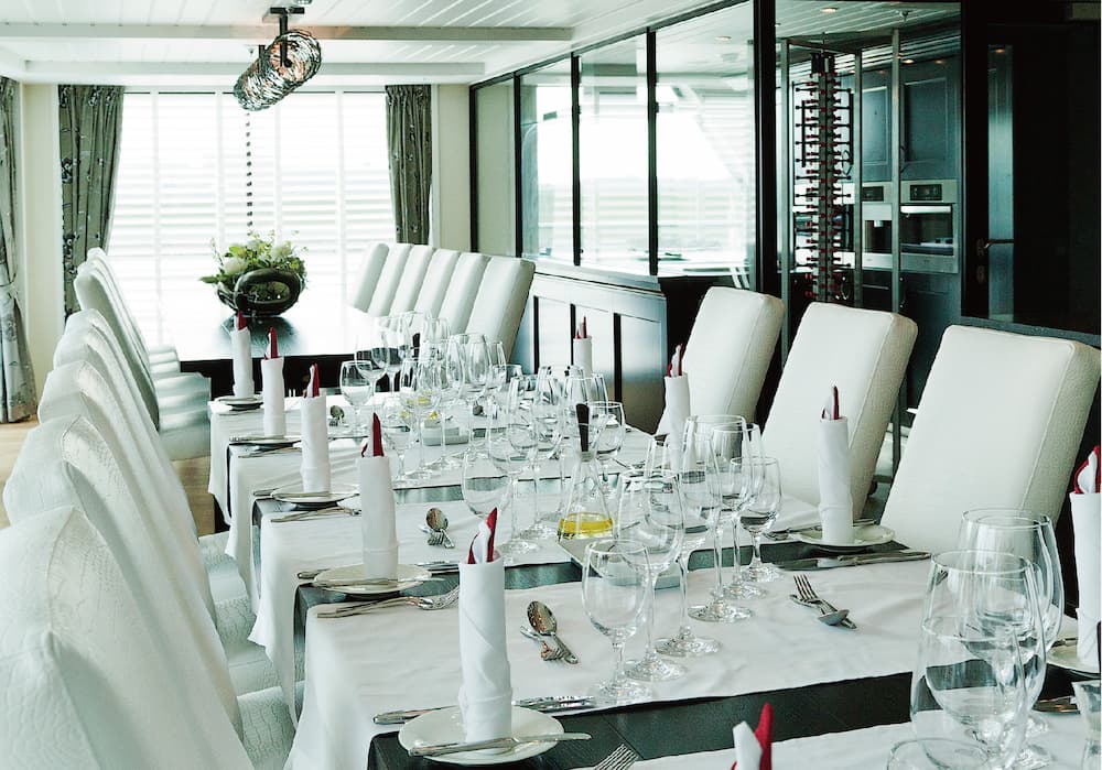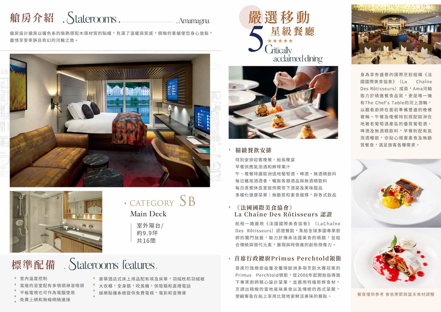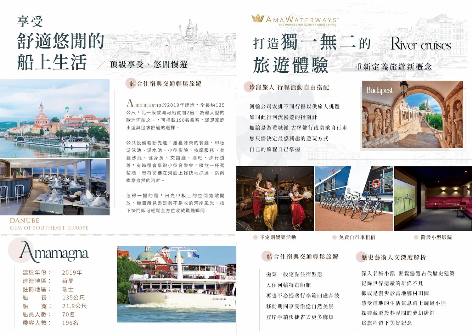 Amamagna於2019年建造,全長約135公尺,比一般歐洲河船寬闊2倍,為最大型的歐洲河船之一,可搭載196名乘客,滿足家庭出遊與追求舒適的選擇。公共設備嶄新先進,屢獲殊榮的餐廳、甲板游泳池、溫水池、按摩服務、美髮沙龍、健身房、交誼廳、酒吧、步行道等,有時還會舉辦小型音樂會,啜飲一杯葡萄酒,音符彷彿在河面上輕快地掠過,跳向綠意盎然的河畔。日光甲板上的空間寬敞開放,極目所見盡是美不勝收的河岸風光,按下快門即可輕鬆全方位收藏驚豔瞬間。