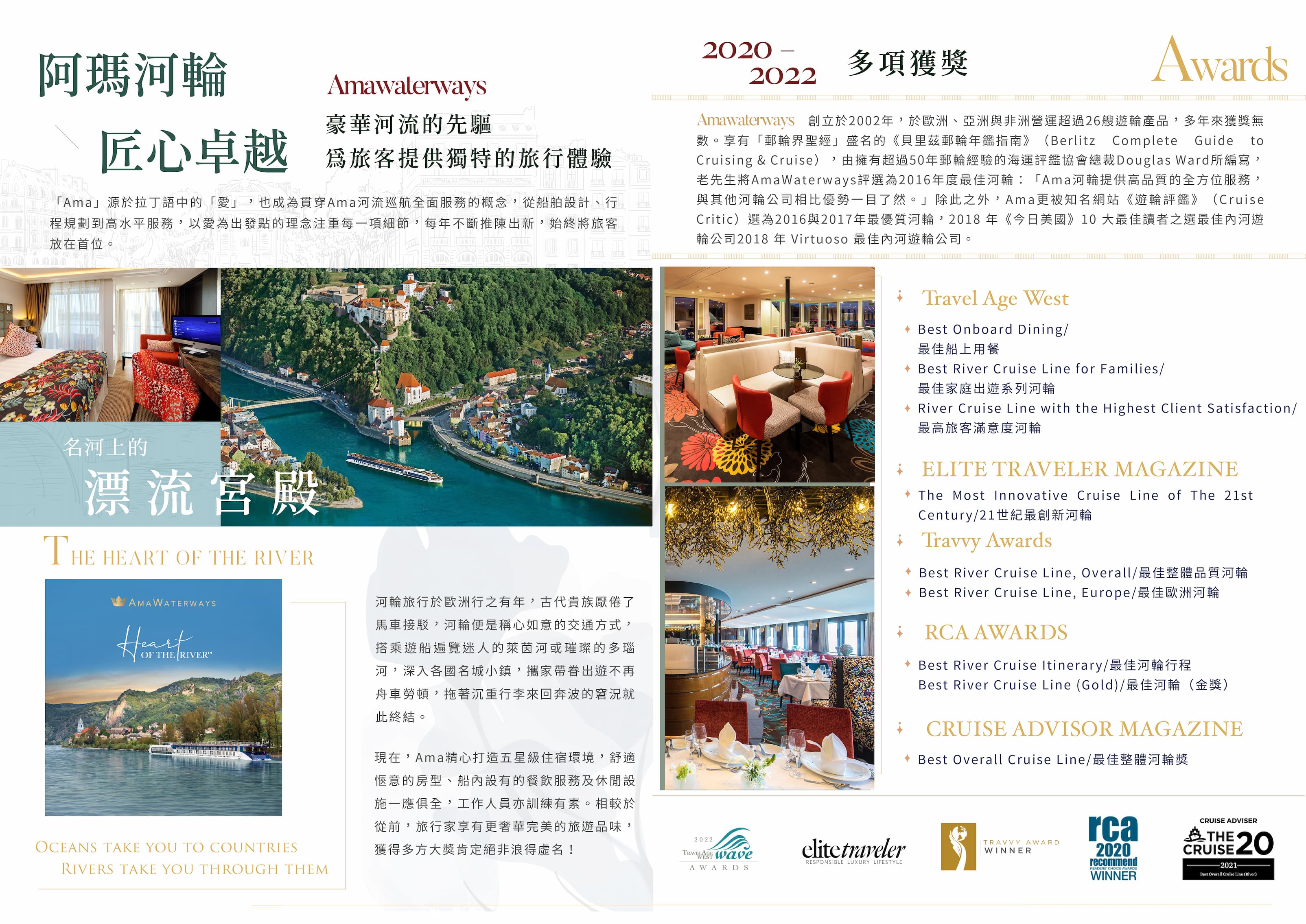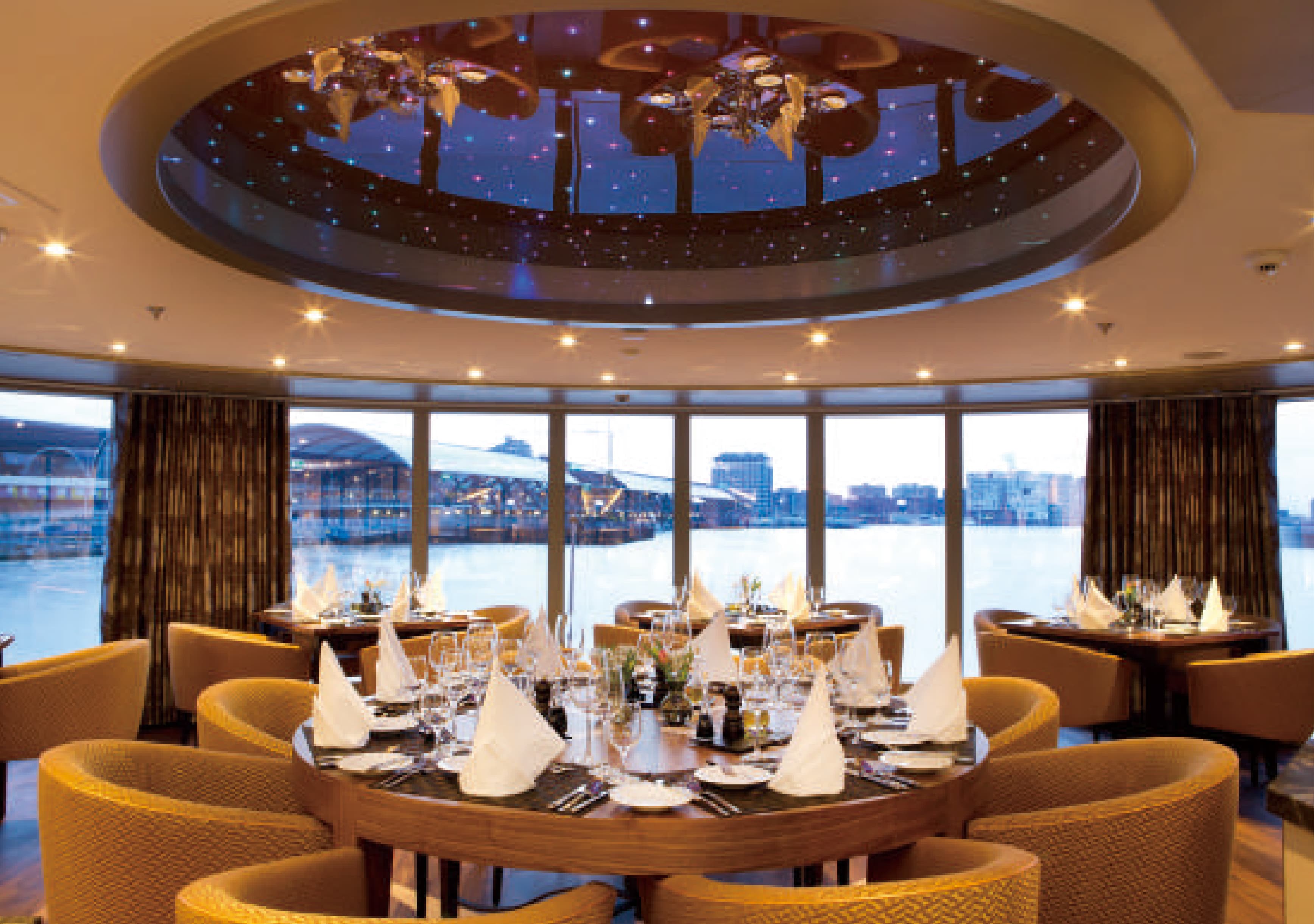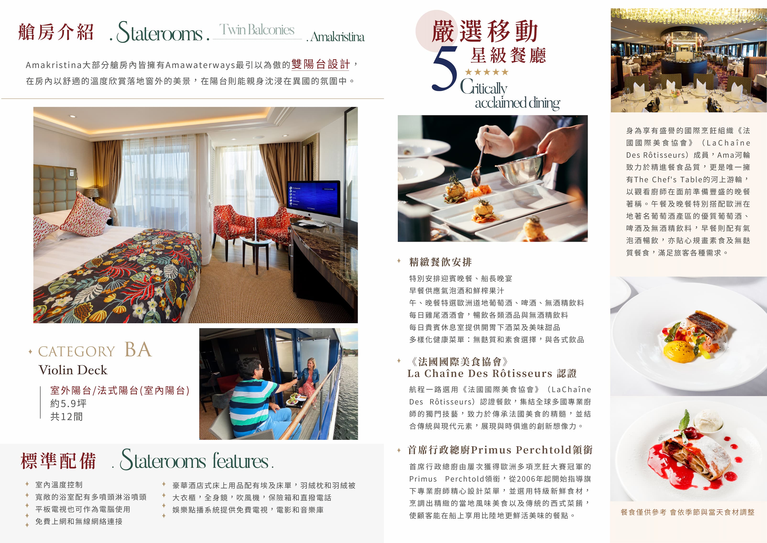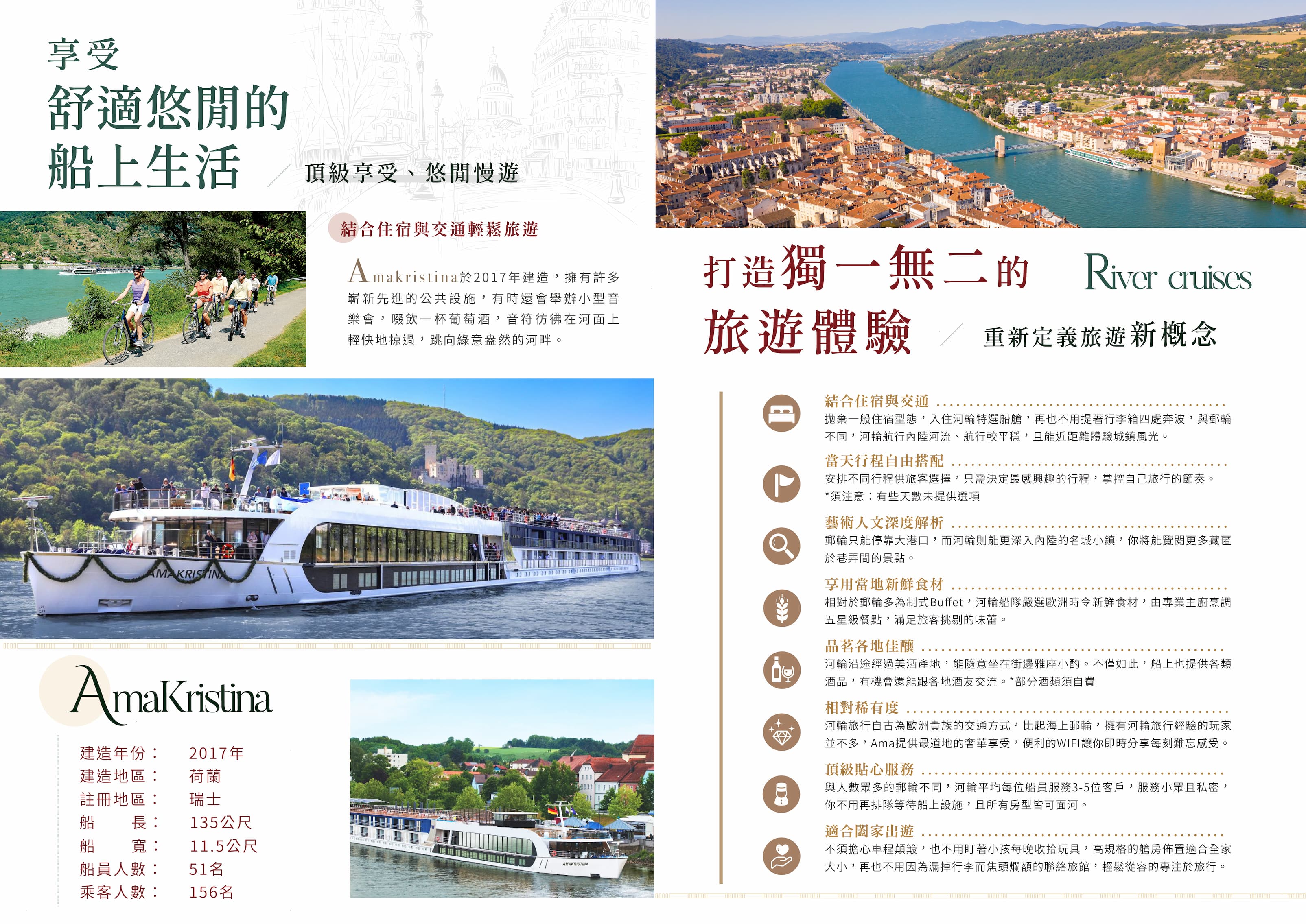 AmaKristina於2017年建造,全長約135公尺,可搭載156名乘客,滿足家庭出遊與追求隱私的河輪玩家。船上語言以英語為主,公共設備嶄新先進:屢獲殊榮的餐廳、甲板游泳池、溫水池、按摩服務、美髮沙龍、健身房、交誼廳、酒吧、步行道等,有時還會舉辦小型音樂會,啜飲一杯雞尾酒,音符彷彿在河面上輕快地掠過,跳向綠意盎然的河畔。值得一提的是,日光甲板上的空間寬敞開放,極目所見盡是美不勝收的河岸風光,按下快門即可輕鬆全方位收藏驚豔瞬間。