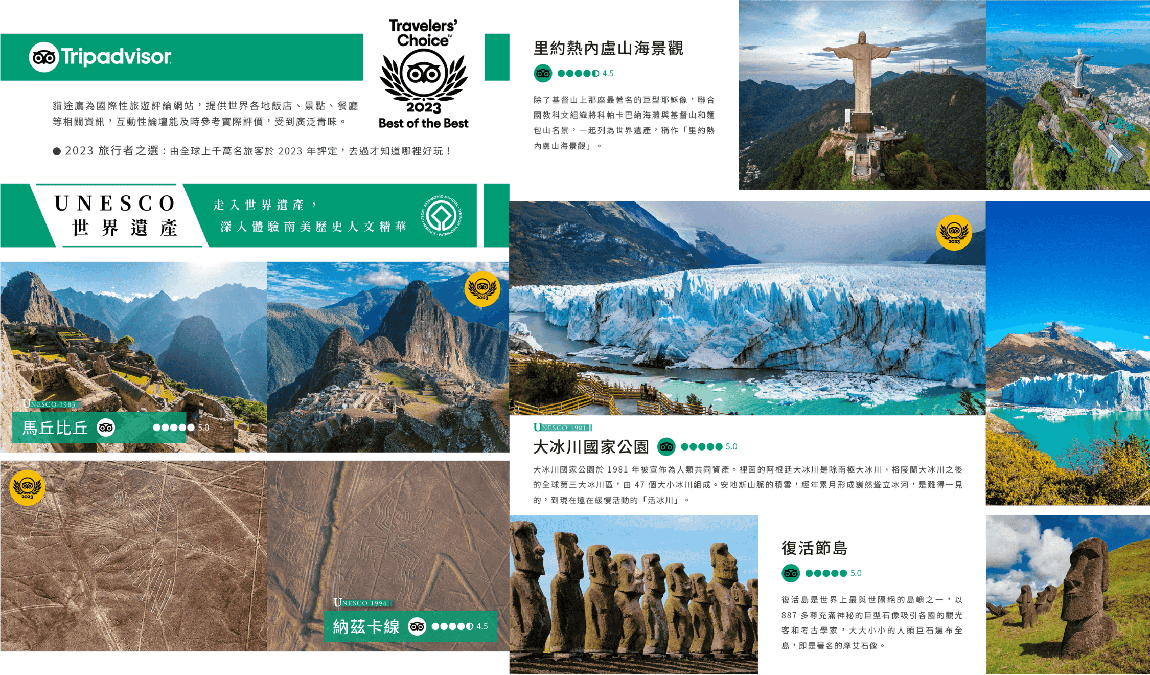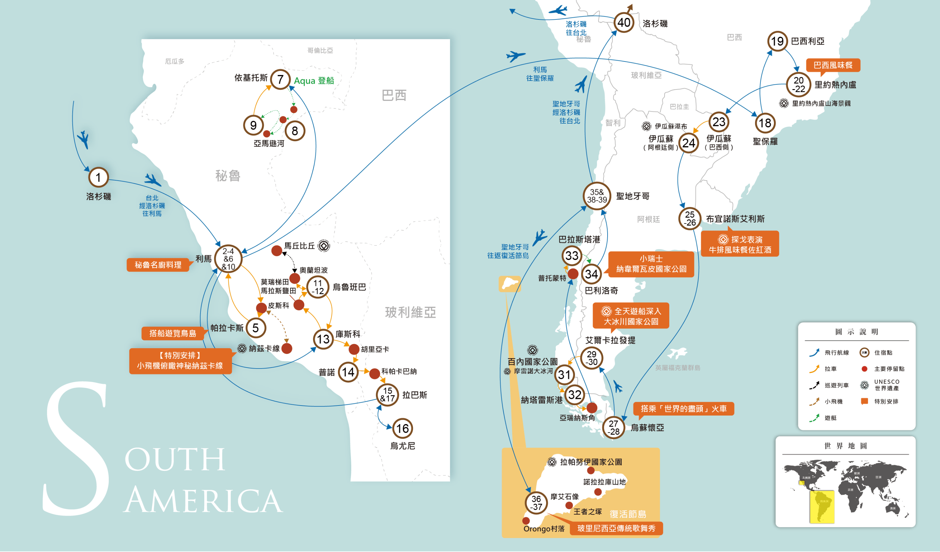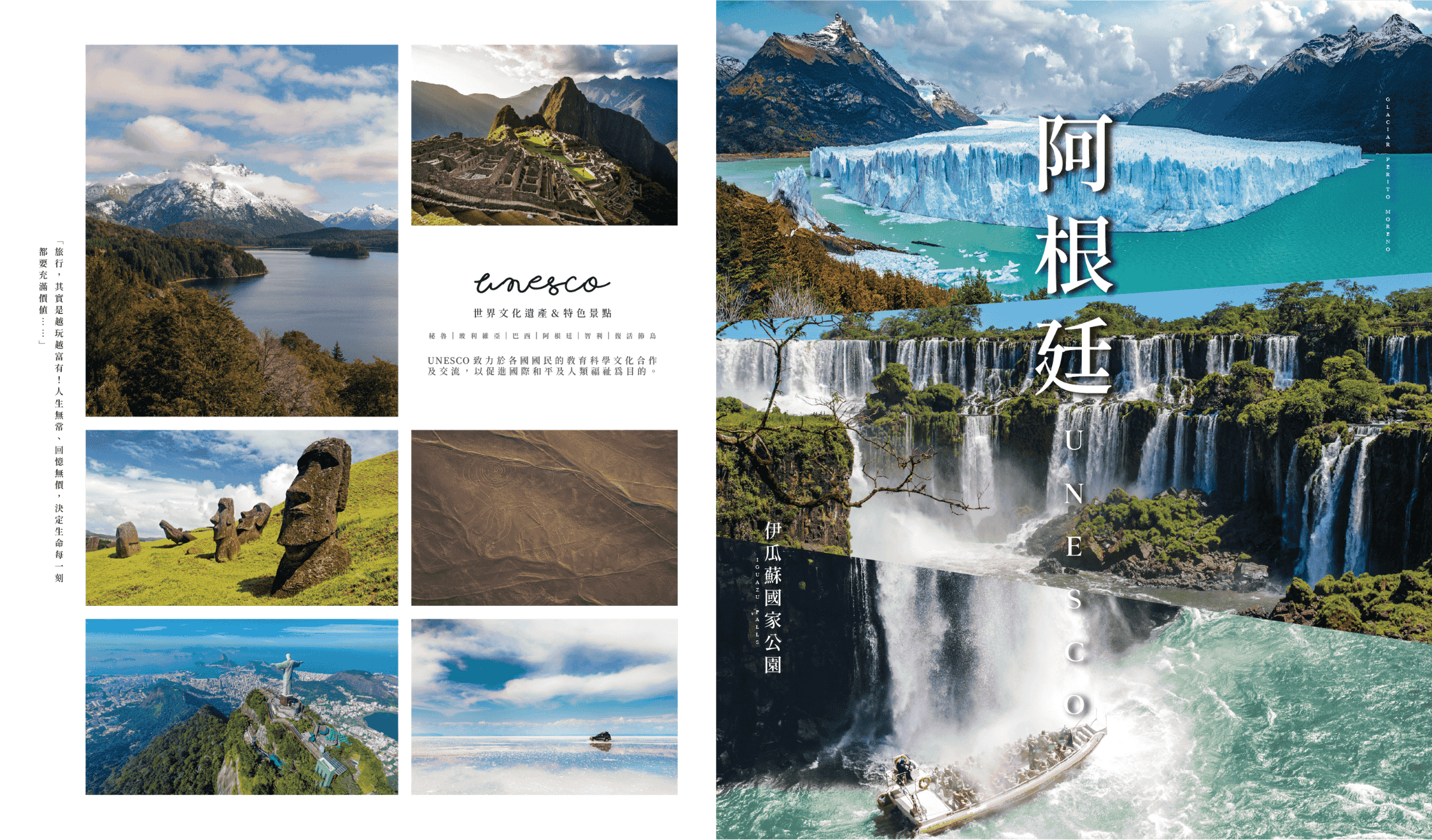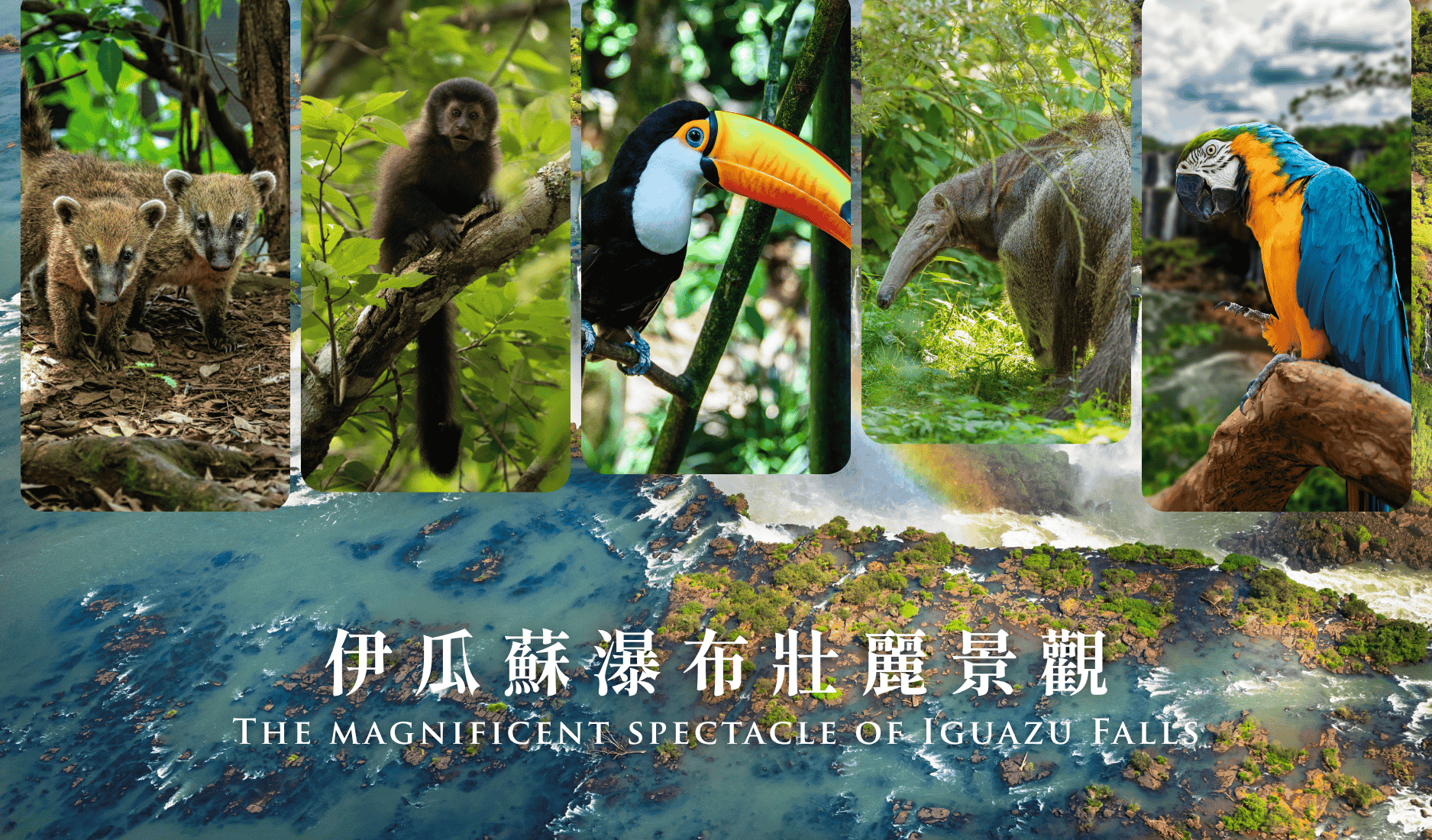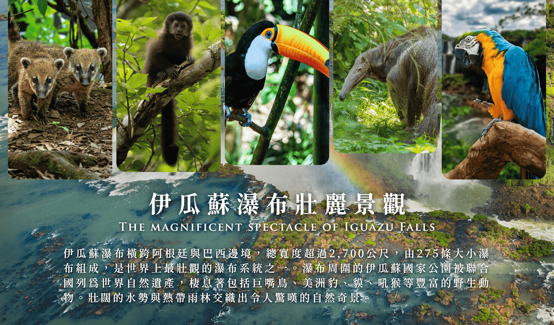 伊瓜蘇瀑布橫跨阿根廷與巴西邊境,總寬度超過2,700公尺,由275條大小瀑布組成,是世界上最壯觀的瀑布系統之一。瀑布周圍的伊瓜蘇國家公園被聯合國列為世界自然遺產,棲息著包括巨嘴鳥、美洲豹、貘、吼猴等豐富的野生動物。壯闊的水勢與熱帶雨林交織出令人驚嘆的自然奇景。