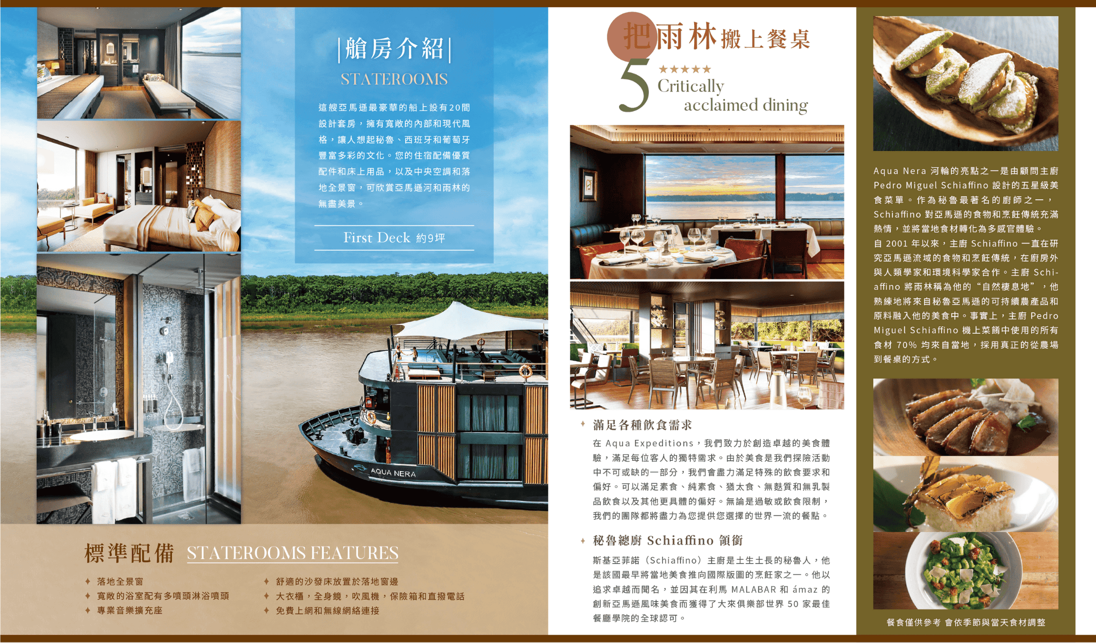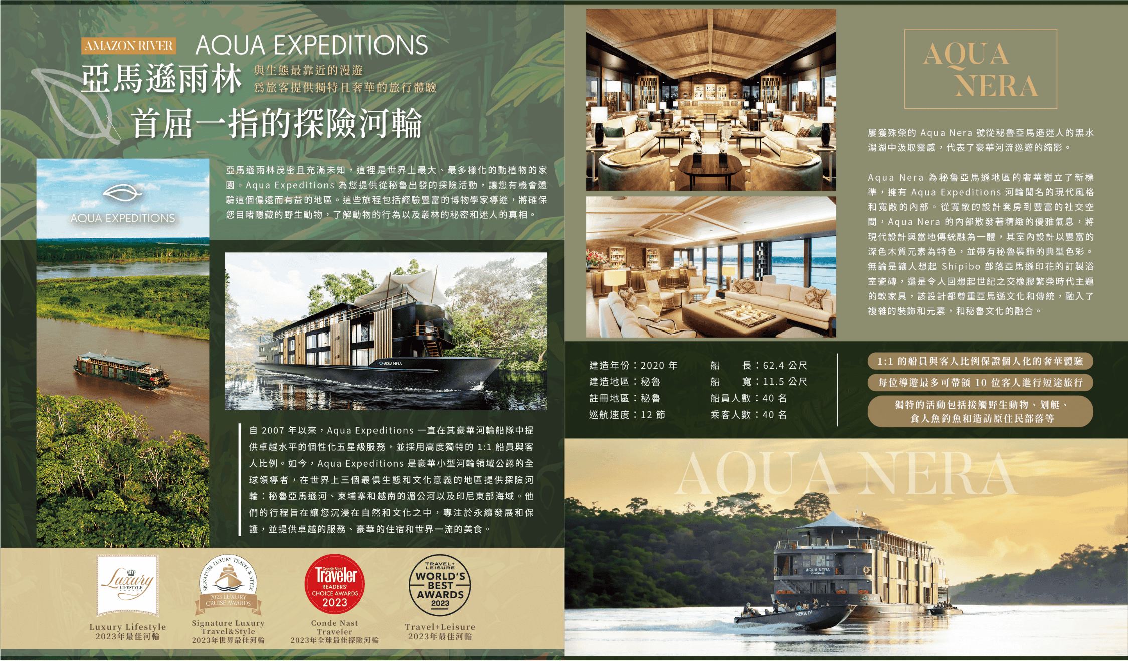 這艘亞馬遜最豪華的船上設有20間設計套房,擁有寬敞的內部和現代風格,讓人想起秘魯、西班牙和葡萄牙豐富多彩的文化。您的住宿配備優質配件和床上用品,以及中央空調和落地全景窗,可欣賞亞馬遜河和雨林的無盡美景。