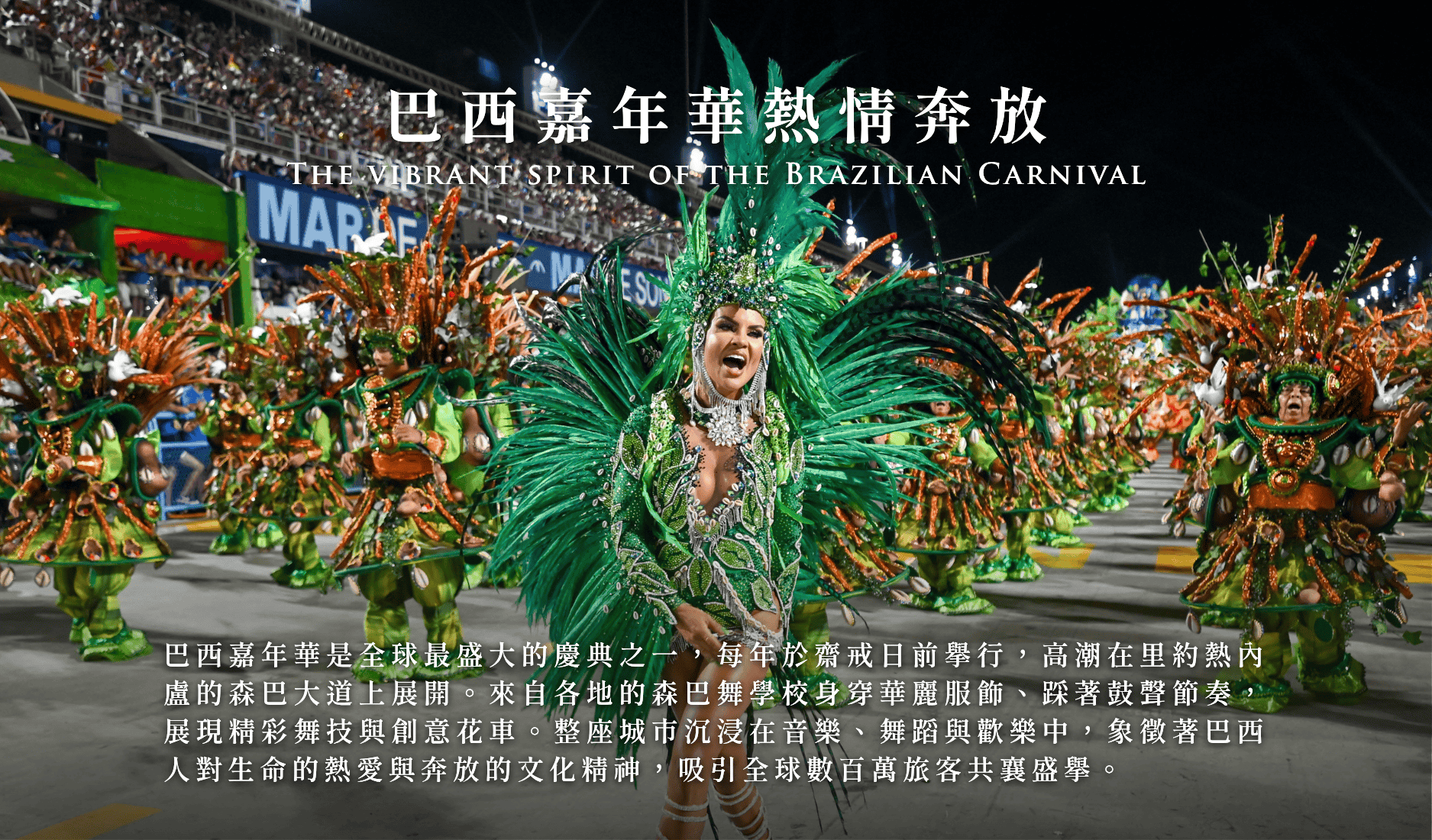 巴西嘉年華是全球最盛大的慶典之一,每年於齋戒日前舉行,高潮在里約熱內盧的森巴大道上展開。來自各地的森巴舞學校身穿華麗服飾、踩著鼓聲節奏,展現精彩舞技與創意花車。整座城市沉浸在音樂、舞蹈與歡樂中,象徵著巴西人對生命的熱愛與奔放的文化精神,吸引全球數百萬旅客共襄盛舉。