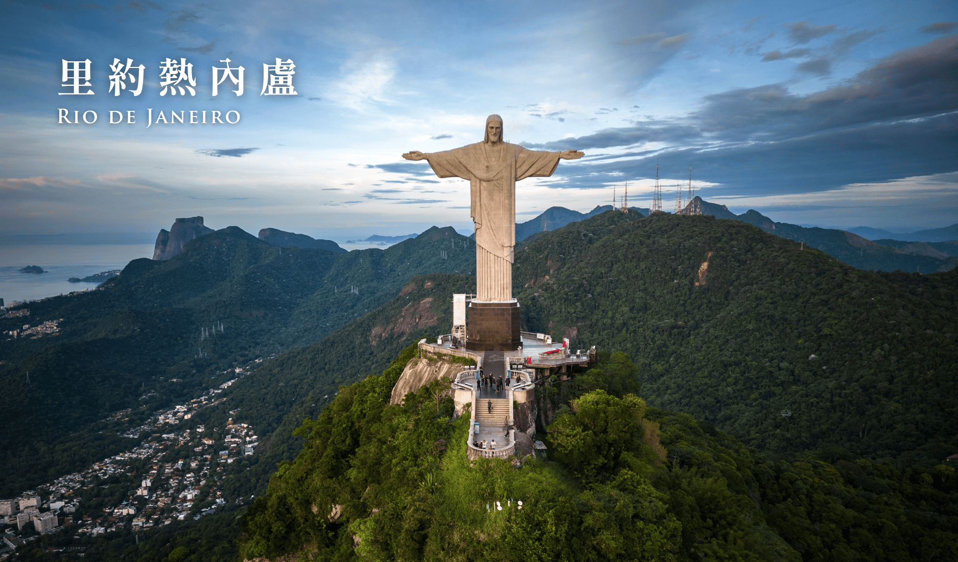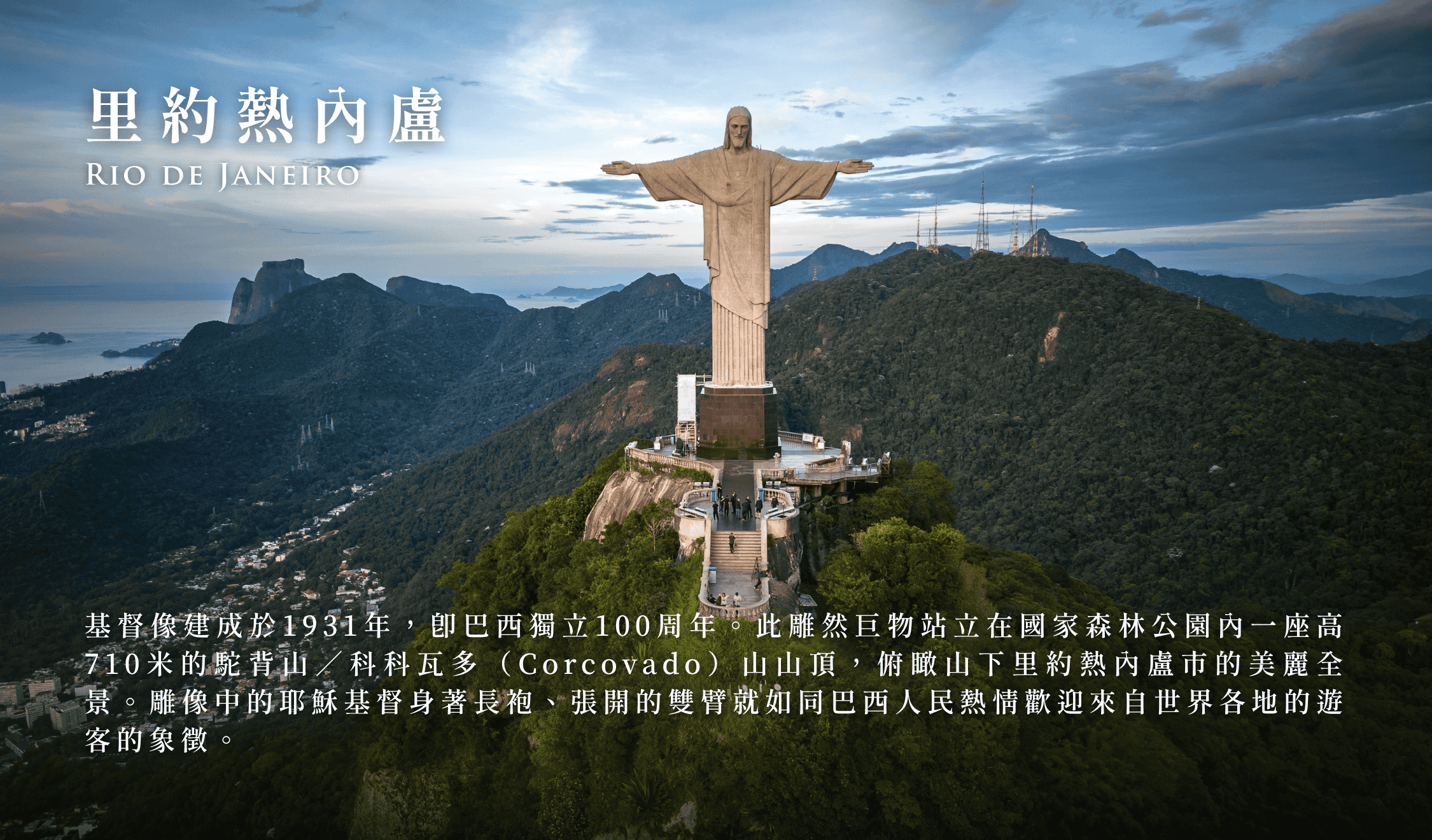 基督像建成於1931年,即巴西獨立100周年。此龐然巨物站立在國家森林公園內一座高710米的駝背山/科科瓦多(Corcovado)山山頂,俯瞰山下里約熱內盧市的美麗全景。雕像中的耶穌基督身著長袍,張開的雙臂就如同巴西人民熱情歡迎來自世界各地的遊客的象征。