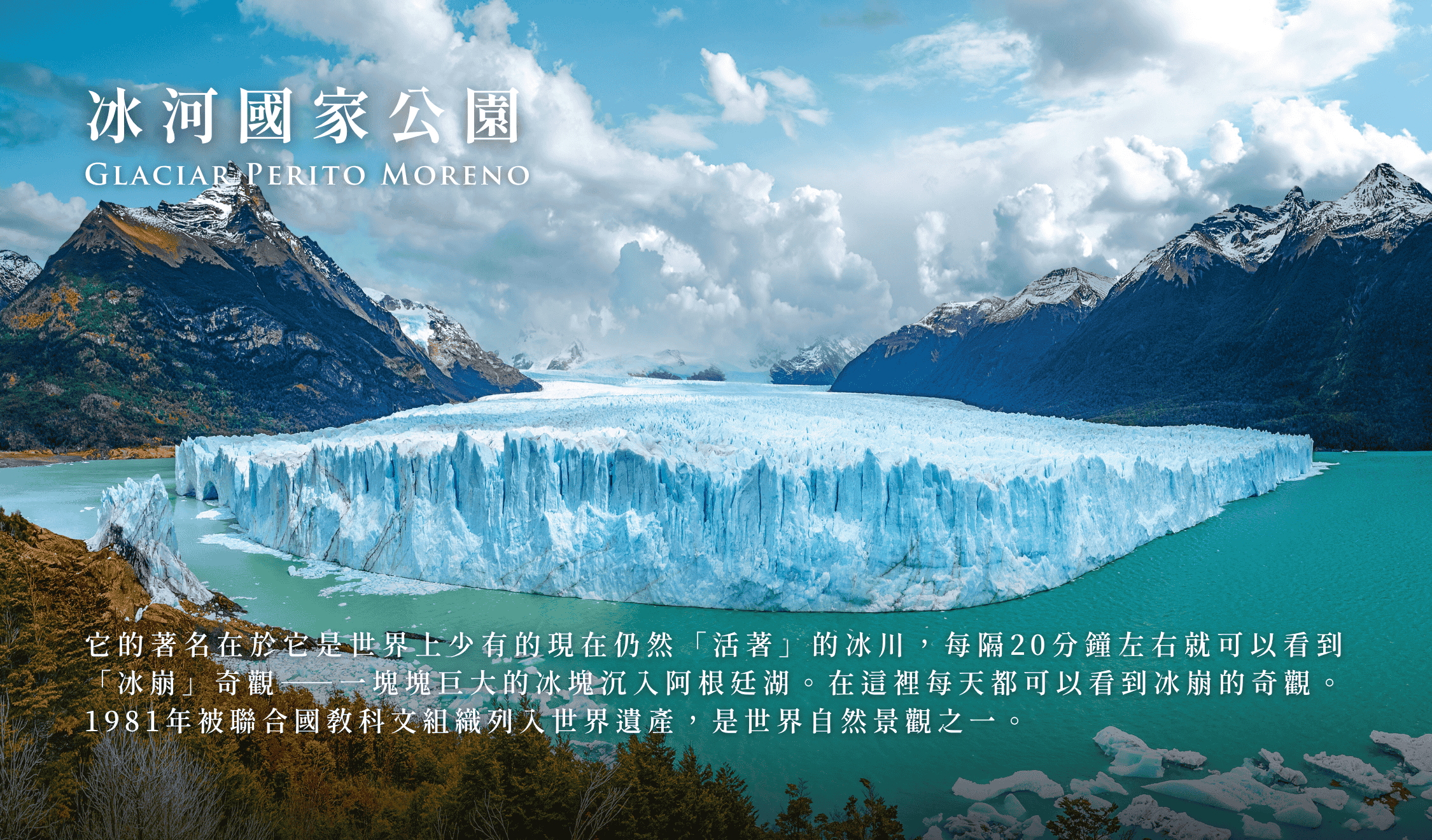 它的著名在於它是世界上少有的現在仍然「活著」的冰川,每隔20分鐘左右就可以看到「冰崩」奇觀:一塊塊巨大的冰塊沉入阿根廷湖,在這裡每天都可以看到冰崩的奇觀,1981年被聯合國教科文組織列入世界遺產,世界自然奇景之一。