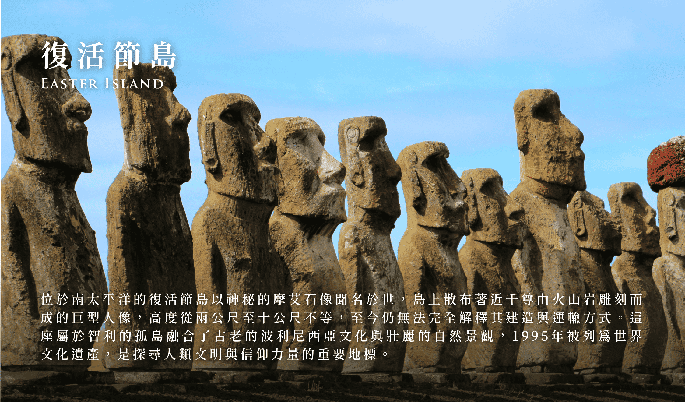 在1772年4月,荷蘭探險家雅可布·羅赫芬,在東南太平洋的大浪中顛波了好幾個月,無意間發現了一個未知的小島,島上佈滿神秘的巨人石像。而當天剛好是復活節,雅可布便在地圖上幫小島署名為『復活節島』,也就是復活節島的名稱由來。