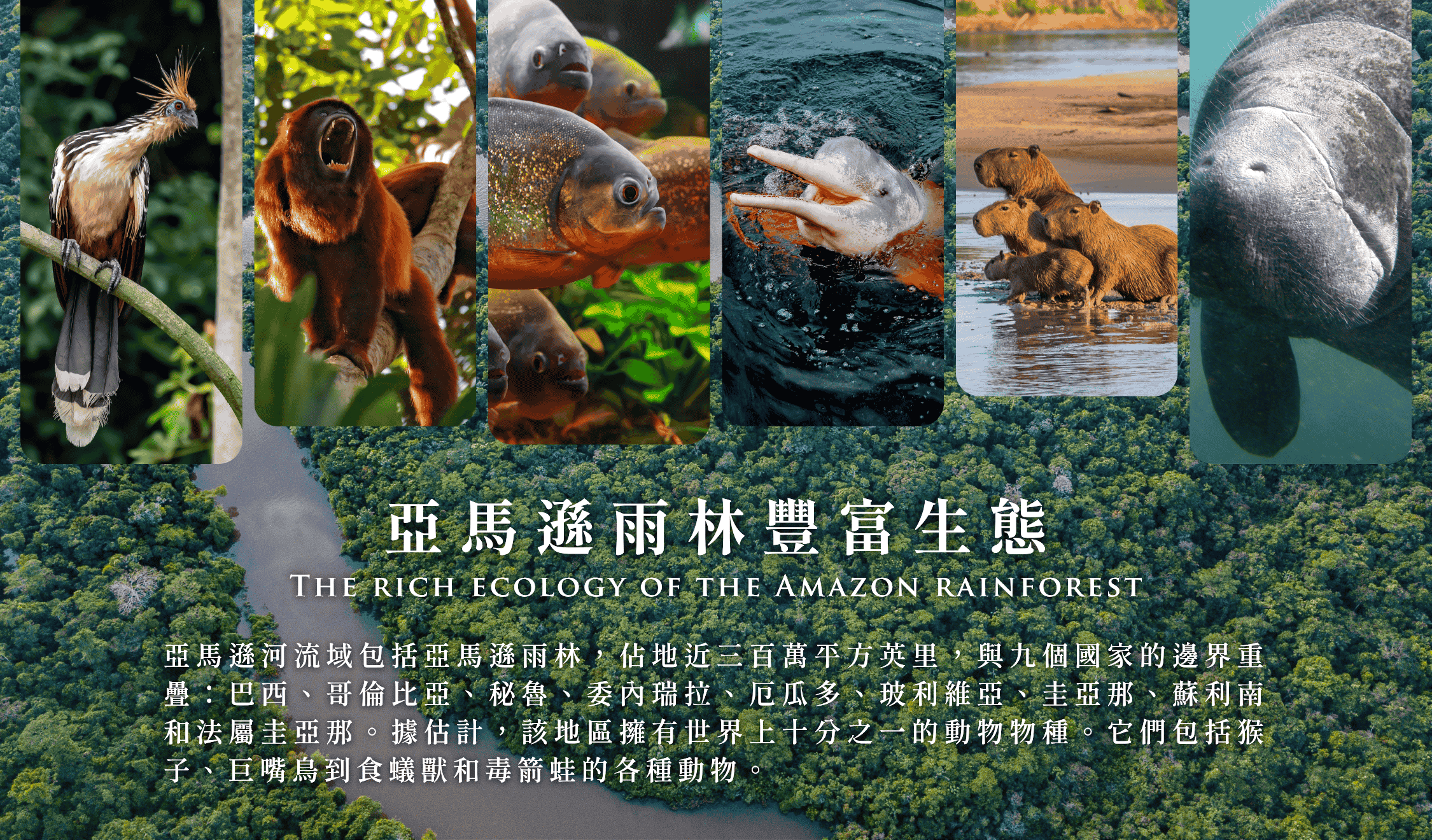 亞馬遜河流域包括亞馬遜雨林,佔地近三百萬平方英里,與九個國家的邊界重疊:巴西、哥倫比亞、秘魯、委內瑞拉、厄瓜多、玻利維亞、圭亞那、蘇利南和法屬圭亞那。據估計,該地區擁有世界上十分之一的動物物種。它們包括從猴子、巨嘴鳥到食蟻獸和毒箭蛙的各種動物。