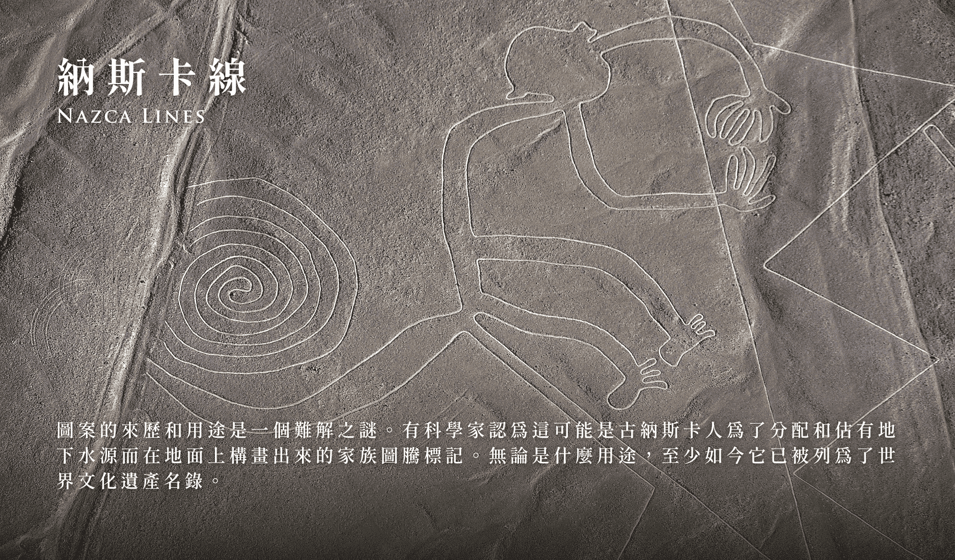 圖案的來歷和用途是一個難解之謎,有科學家認為這可能是古納斯卡人為了分配和佔有地下水源而在地面上構畫出來的家族圖騰標記,無論是什麼用途,至少如今它已被列為了世界文化遺產名錄。