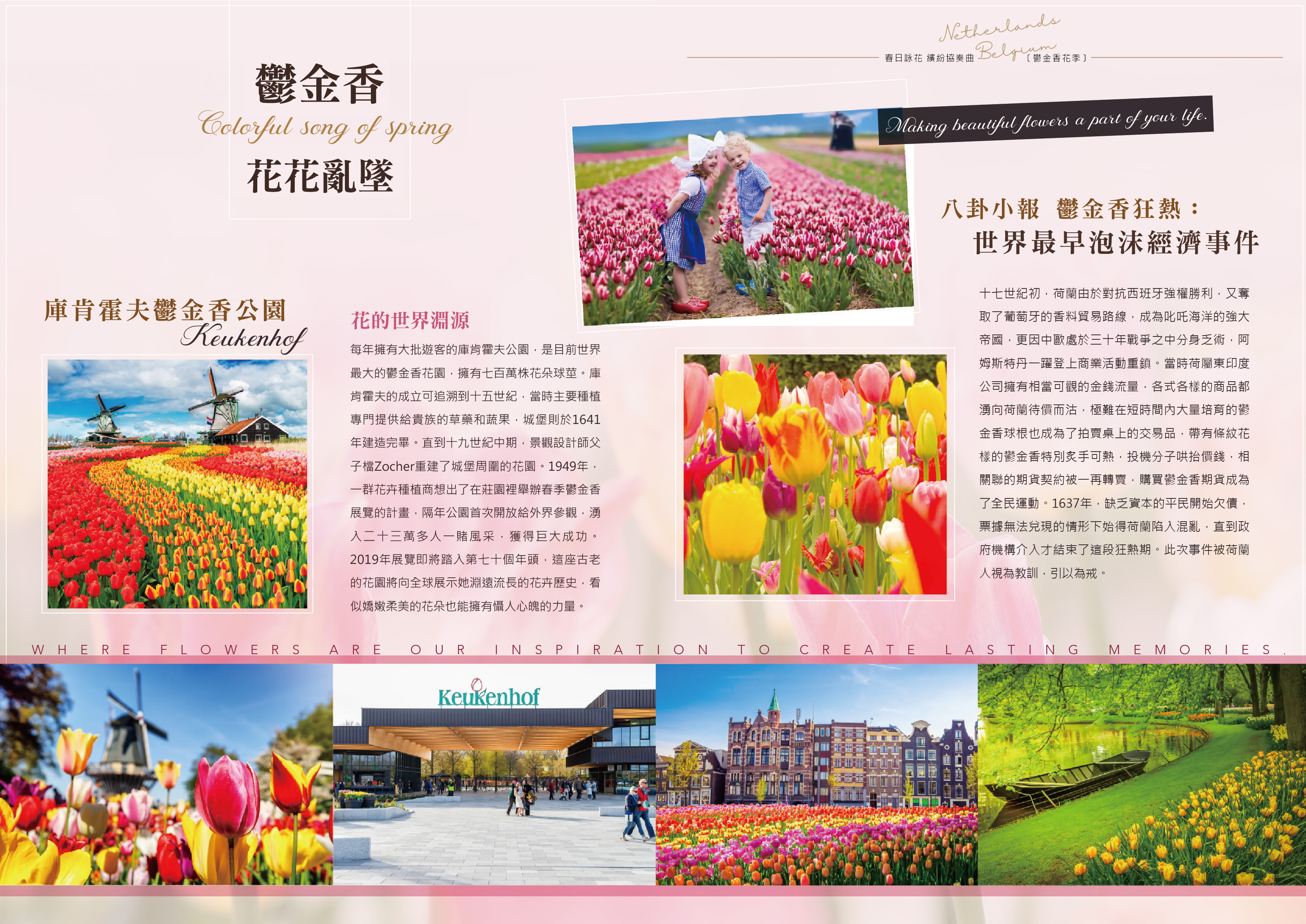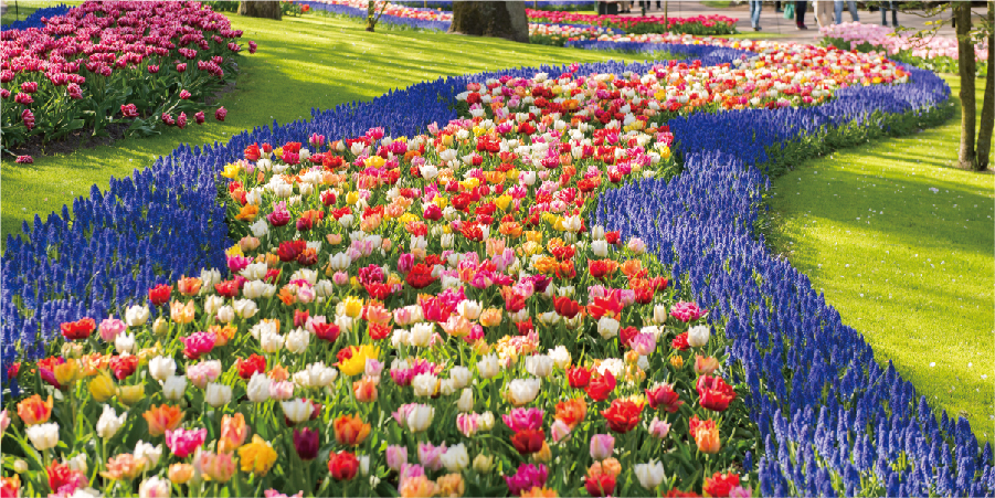 每年擁有大批遊客的庫肯霍夫公園,是目前世界最大的鬱金香花園,擁有七百萬株花朵球莖。庫肯霍夫的成立可追溯到十五世紀,當時主要種植專門提供給貴族的草藥和蔬果,城堡則於1641年建造完畢。直到十九世紀中期,景觀設計師父子檔Zocher重建了城堡周圍的花園。1949年,一群花卉種植商想出了在莊園裡舉辦春季鬱金香展覽的計畫,隔年公園首次開放給外界參觀,湧入二十三萬多人一賭風采,獲得巨大成功。2019年展覽即將踏入第七十個年頭,這座古老的花園將向全球展示她淵遠流長的花卉歷史,看似嬌嫩柔美的花朵也能擁有懾人心魄的力量。