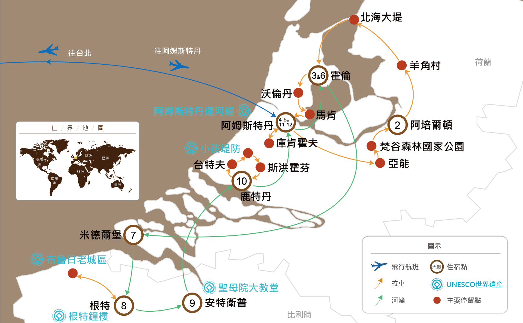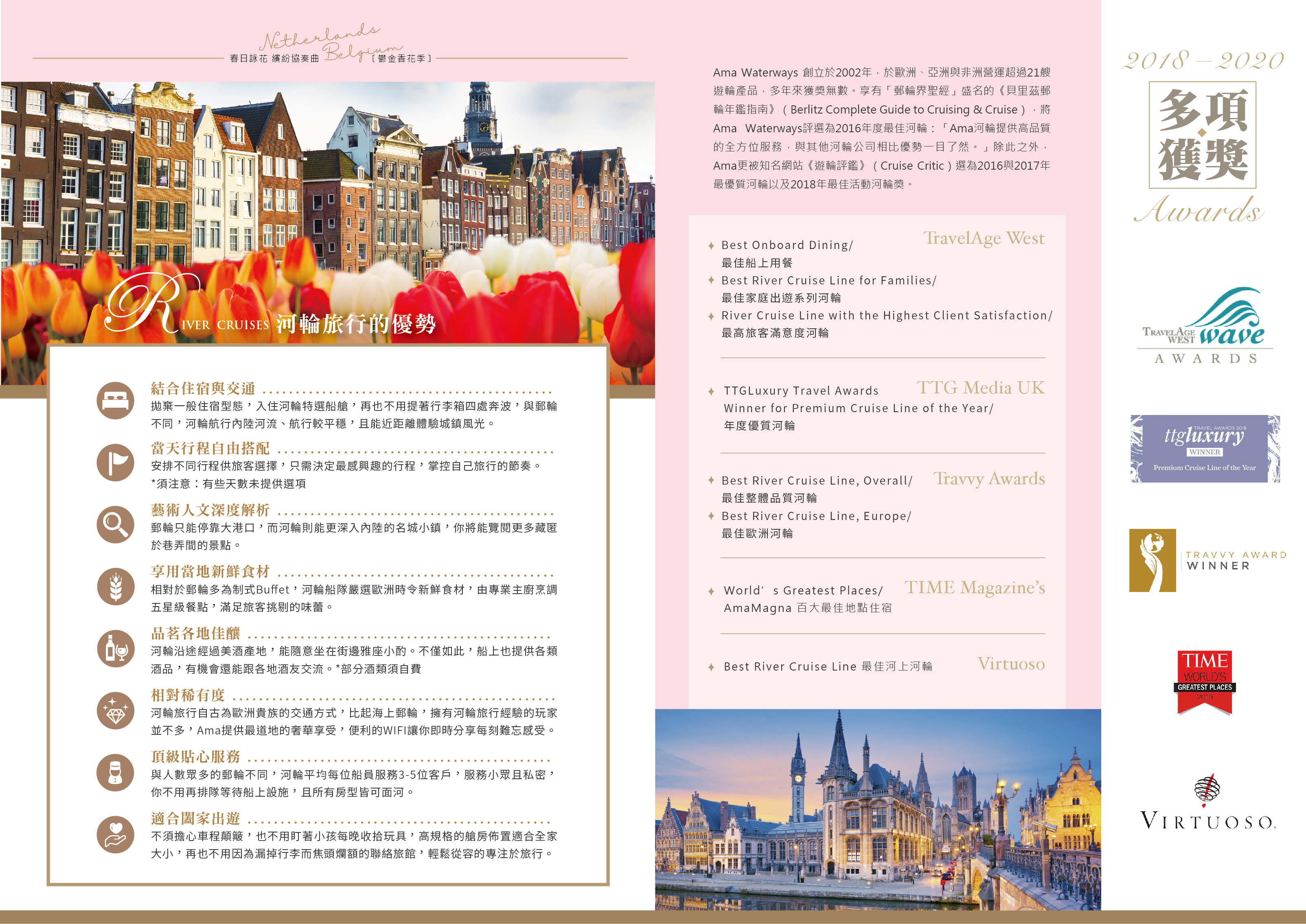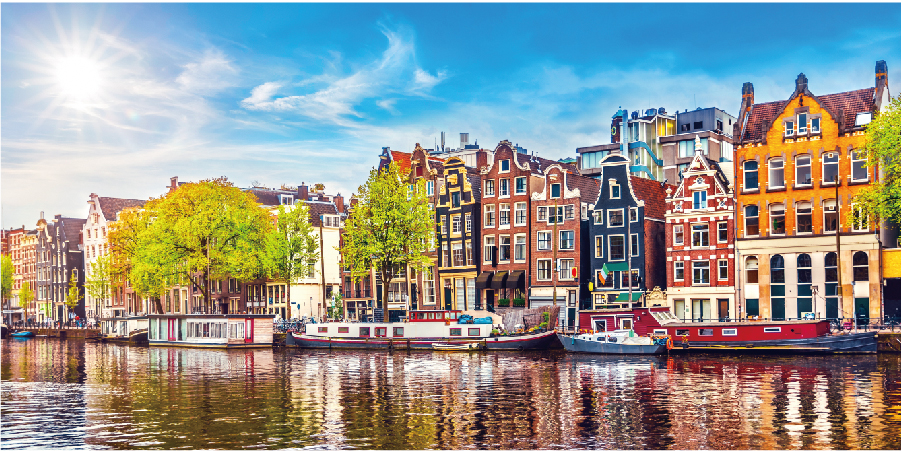 於十七世紀荷蘭黃金時代開挖,總長超過100公里,環繞城市以輻射狀向外拓展形成運河帶。由於都市計畫規範完善,主要運河沿線1550座古蹟大多維護良好,搭乘遊船欣賞沿途垂柳和高低起伏的瘦長房屋,見證古人的先覺先知。