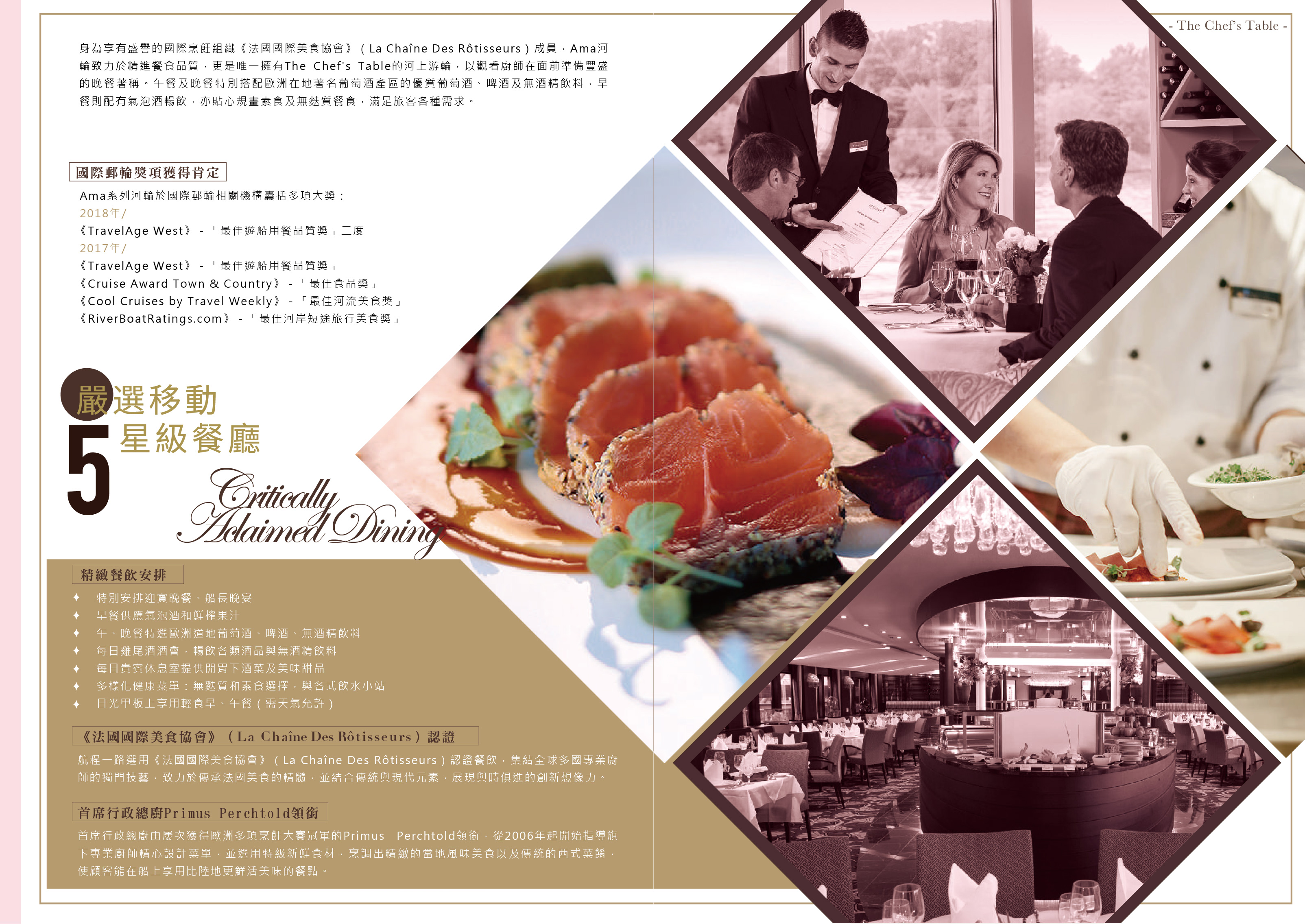 AmaLucia於2021年建造,全長約135公尺,可搭載156名乘客,滿足家庭出遊與追求隱私的河輪玩家。船上語言以英語為主,公共設備嶄新先進:屢獲殊榮的餐廳、甲板游泳池、溫水池、按摩服務、美髮沙龍、健身房、交誼廳、酒吧、步行道等,有時還會舉辦小型音樂會,啜飲一杯雞尾酒,音符彷彿在河面上輕快地掠過,跳向綠意盎然的河畔。值得一提的是,日光甲板上的空間寬敞開放,極目所見盡是美不勝收的河岸風光,按下快門即可輕鬆全方位收藏驚豔瞬間。