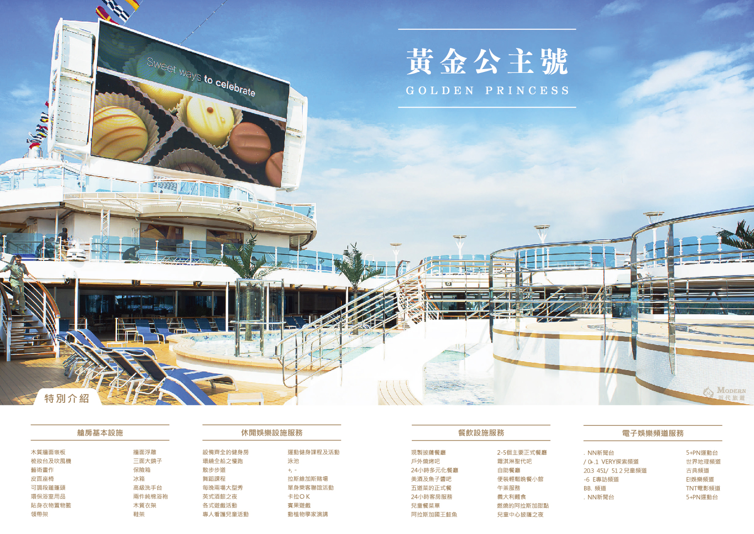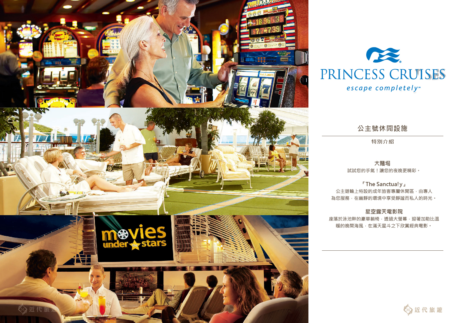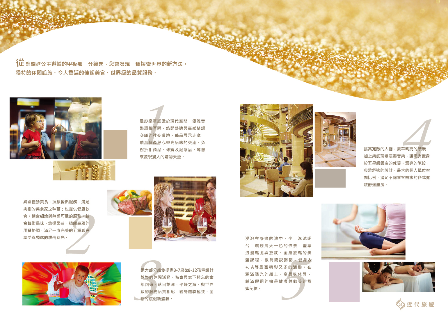 這艘經典非凡的遊輪見證了公主遊輪對創新設計與變革的不懈追求,具有重要的象徵意義。遊輪上的全新特色設施包括義式風情的中庭廣場,成人專屬的聖殿成人休憩區,和浪漫愜意的星空露天電影院等,深受乘客們的喜愛。