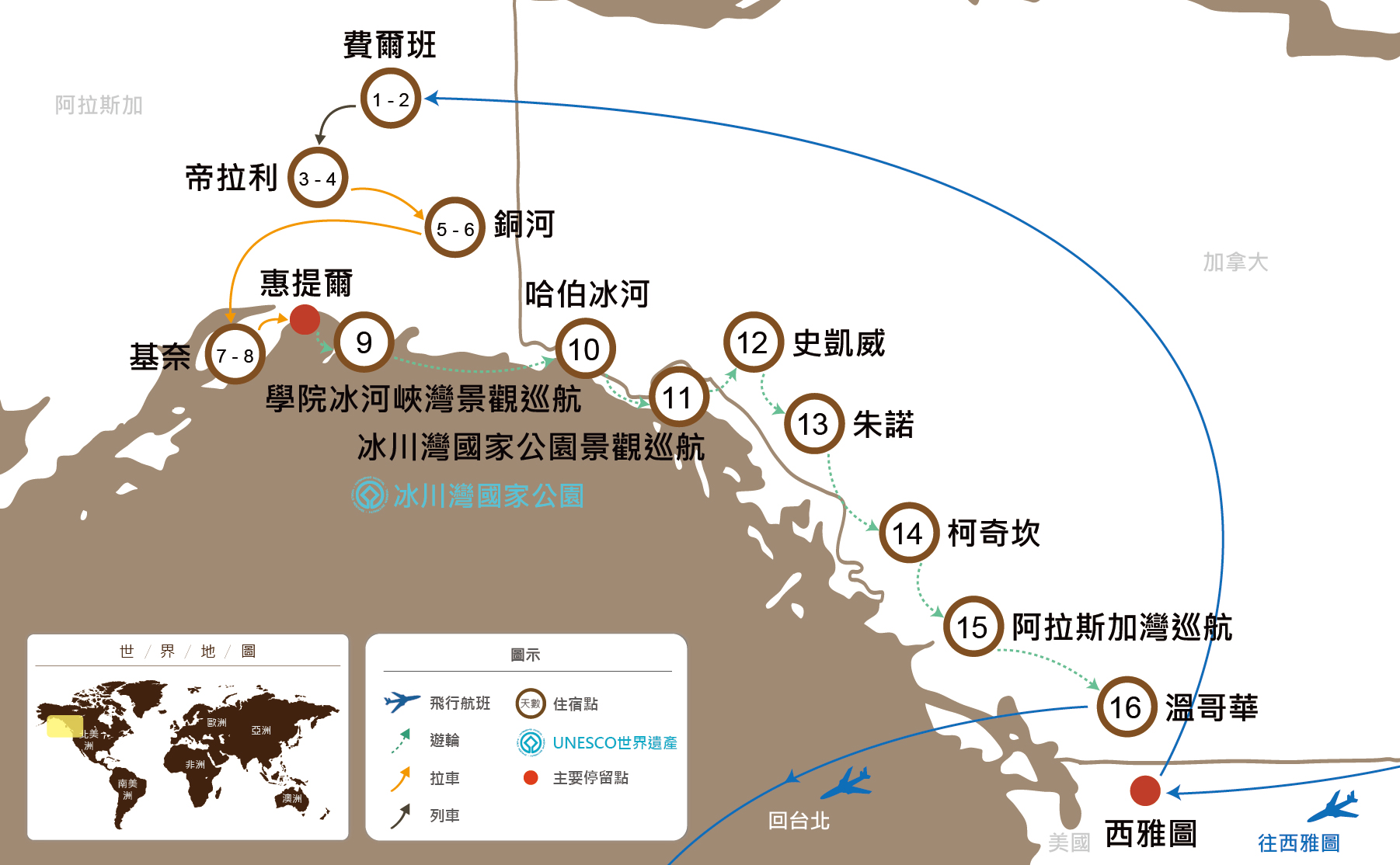 在前往育空的門戶,特別安排搭乘知名的白色隘口景觀火車;包含阿拉斯加鮭魚的豐盛BBQ大餐;沿著景色秀麗的柯隆戴克高速公路盡情欣賞自然風光;親手體驗淘金樂趣。