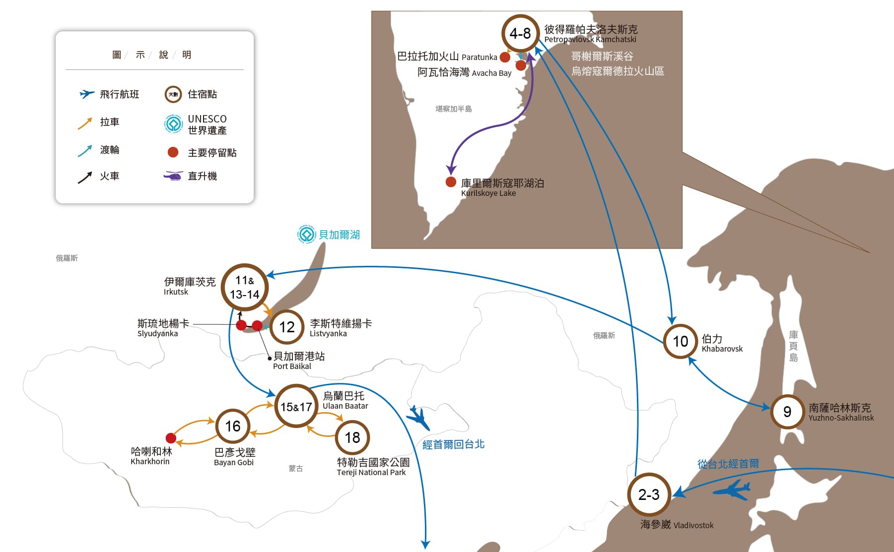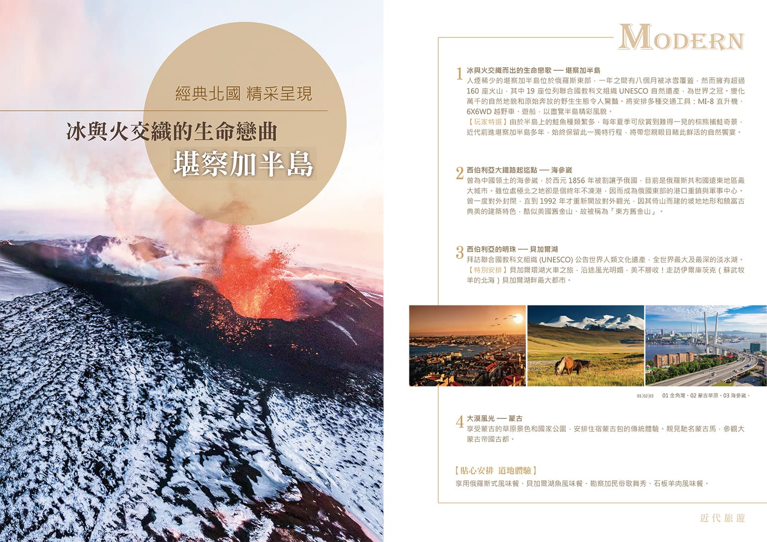人煙稀少的堪察加半島位於俄羅斯東部,一年之間有八個月被冰雪覆蓋,然而擁有超過160座火山,其中19座位列聯合國教科文組織UNESCO自然遺產,為世界之冠。變化萬千的自然地貌和原始奔放的野生生態令人驚豔。將安排多種交通工具:MI-8直升機、6X6WD越野車、遊船,以盡覽半島精彩風貌。