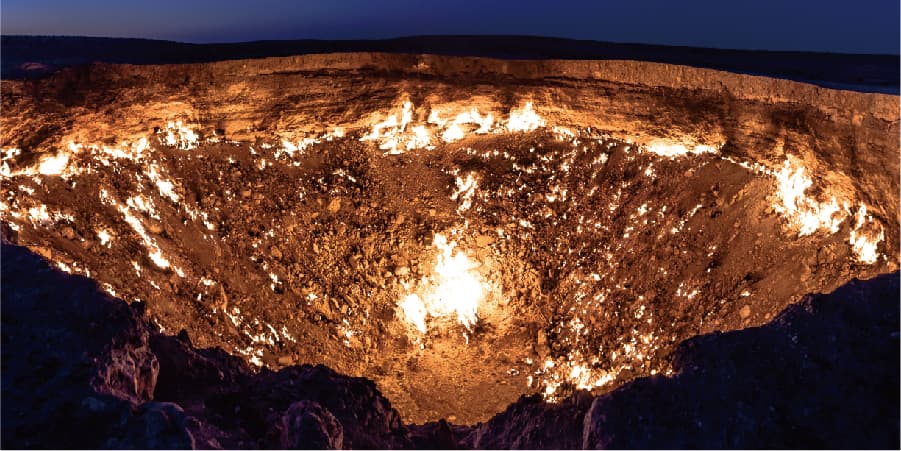 1971年前蘇聯地質學家探勘時意外發現的天然氣地下洞穴,因一場意外造成地表塌陷成直徑百米的大洞,有毒氣體不斷向外洩漏,地質學家們決定點燃天然氣以免有害氣體影響人體健康,原以為幾天就能平息的火焰,直至今日熊熊燃燒了近四十個年頭,這意外的決策創造了現在舉世無雙的奇景。