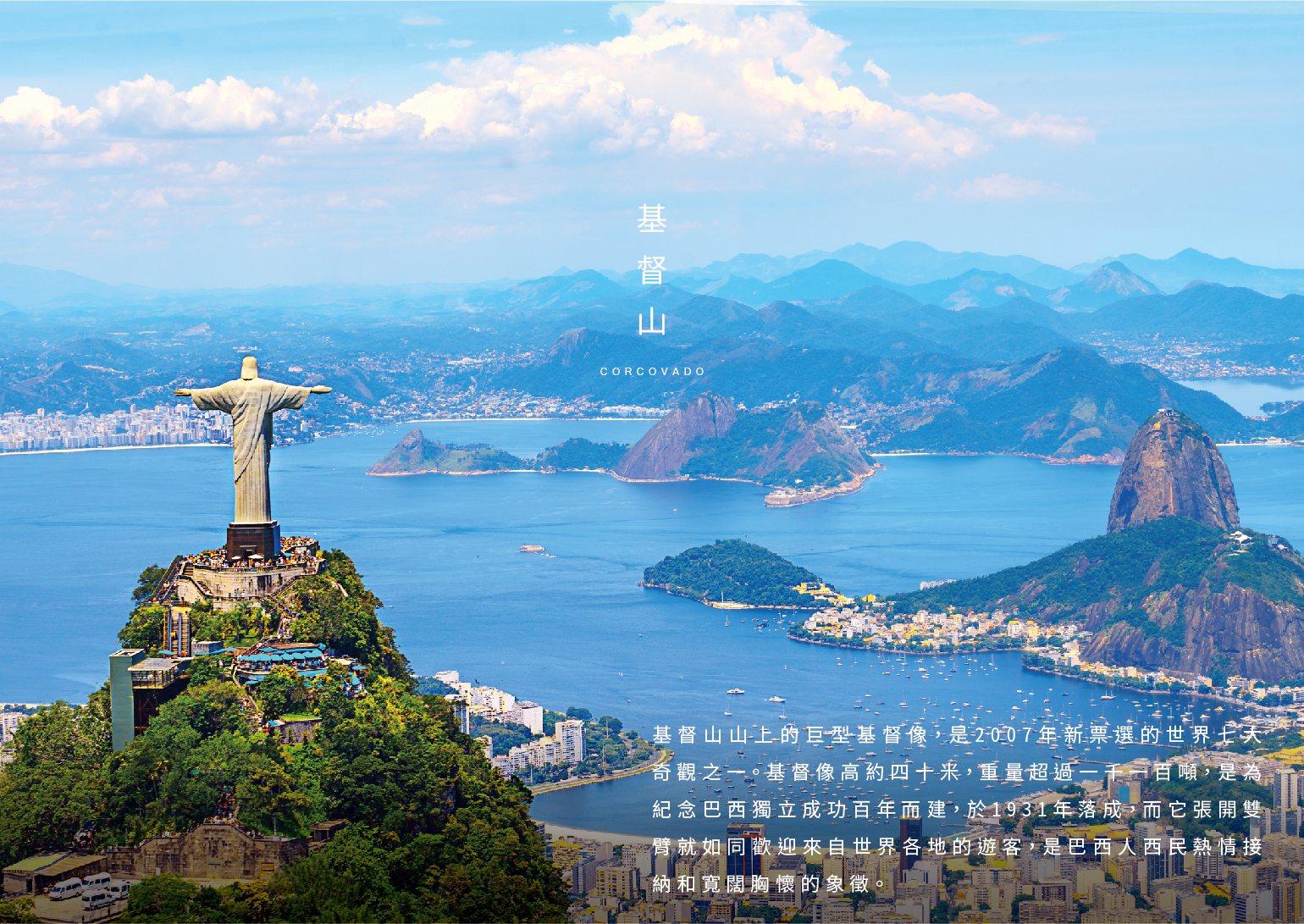 基督山山上的巨型基督像,是2007年新票選的世界七大奇觀之一。基督像高約四十米,重量超過一千一百噸,是為紀念巴西獨立成功百年而建,於1931年落成,而它張開雙臂就如同歡迎來自世界各地的遊客,是巴西人西民熱情接納和寬闊胸懷的象徵。