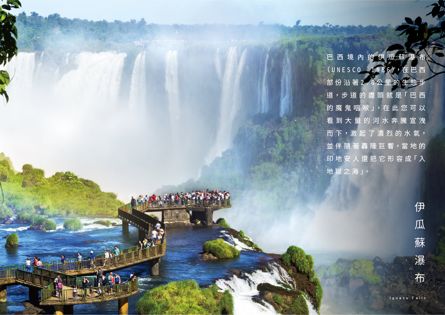 巴西境內的伊瓜蘇瀑布(UNESCO 1986),在巴西部份沿著2.6公里的生態步道,步道的盡頭就是「巴西的魔鬼咽喉」,在此您可以看到大量的河水奔騰宣洩而下,激起了濃烈的水氣,並伴隨著轟隆巨響,當地的印地安人還把它形容成「入地獄之海」。