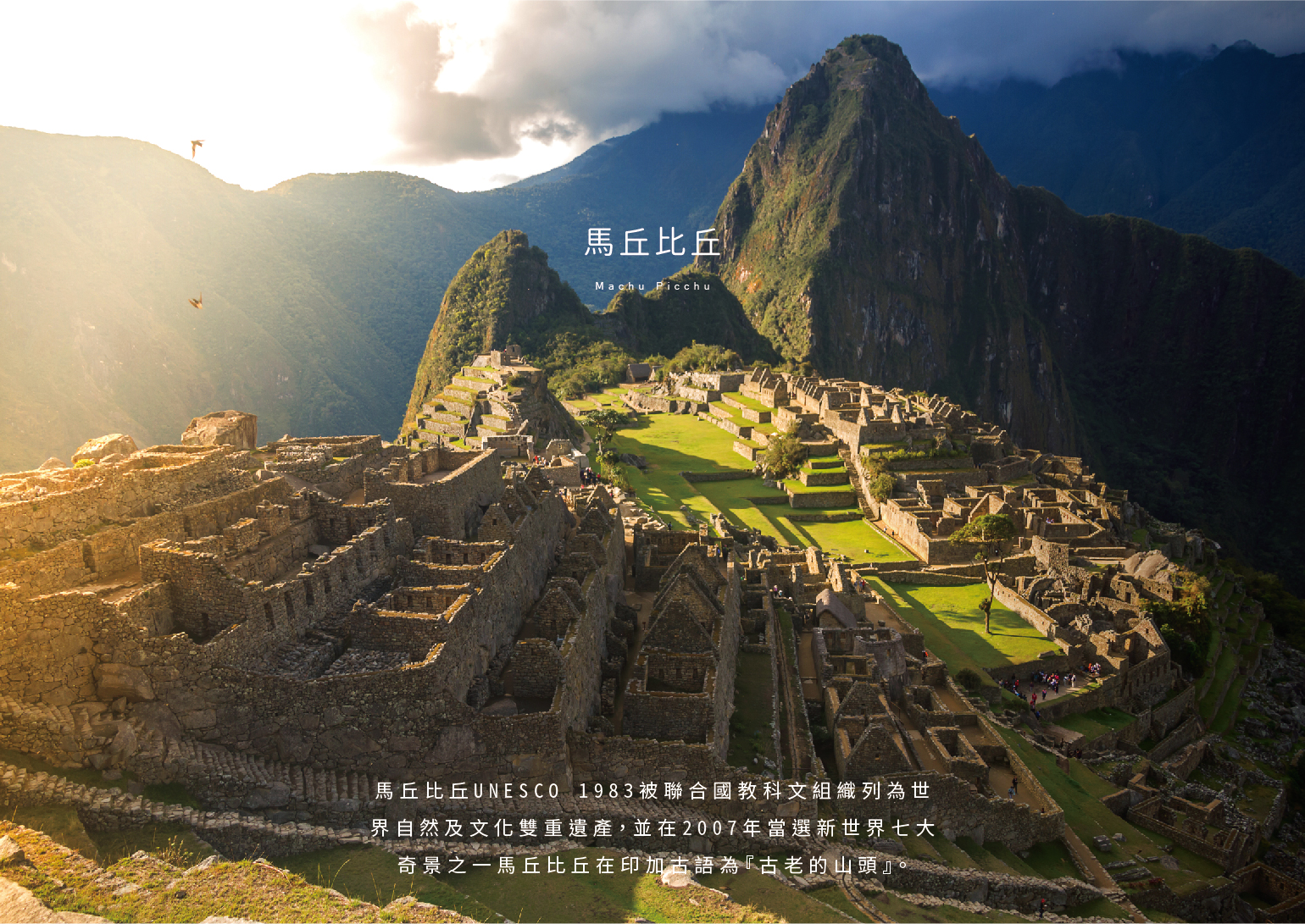 馬丘比丘UNESCO 1983被聯合國教科文組織列為世界自然及文化雙重遺產,並在2007年當選新世界七大奇景之一馬丘比丘在印加古語為『古老的山頭』。