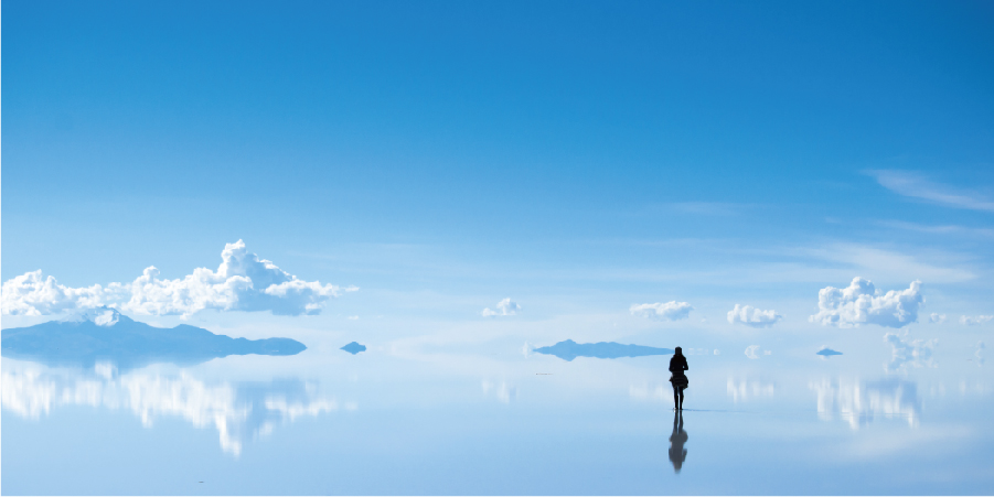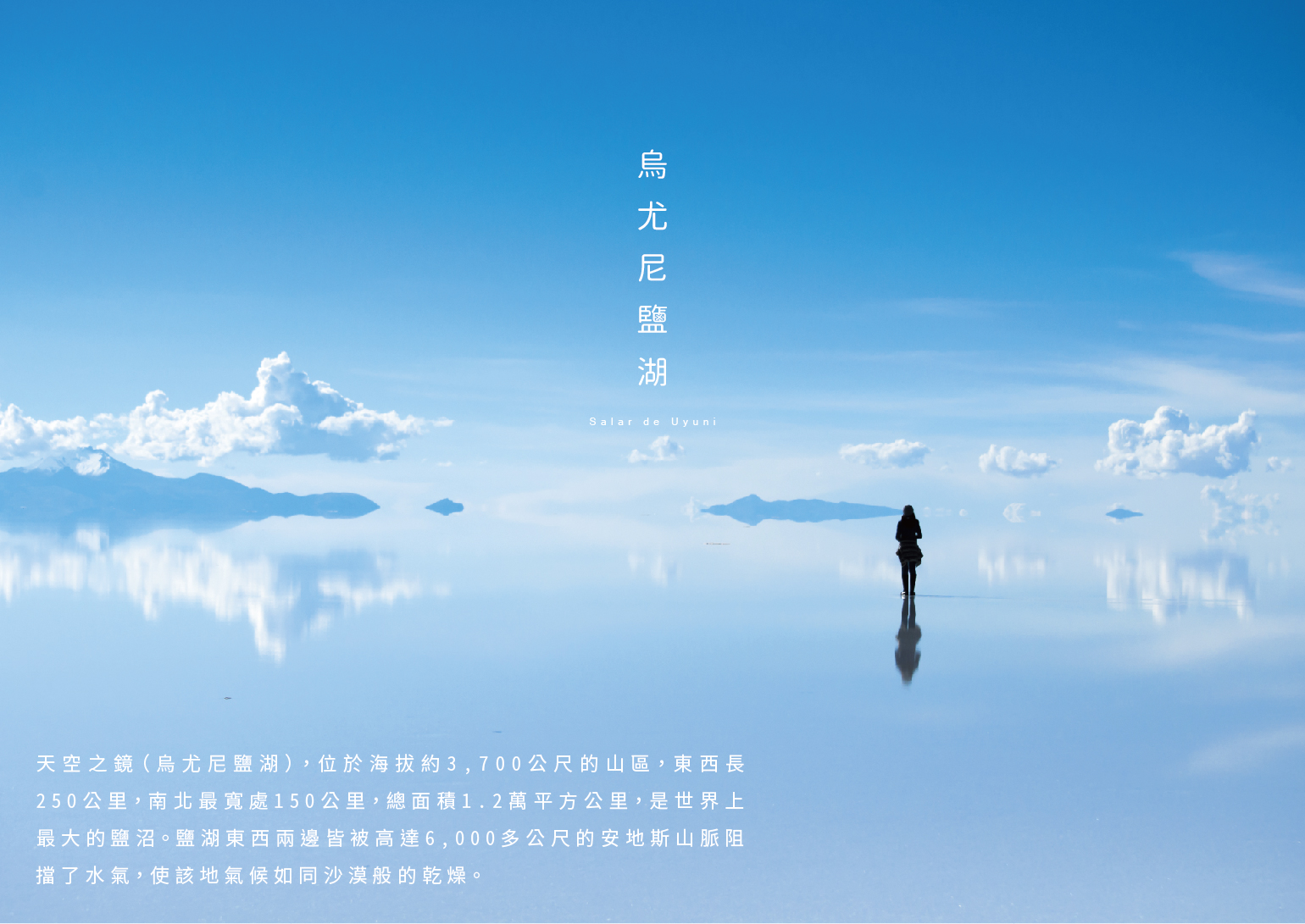 天空之鏡Salar de Uyuni(烏尤尼鹽湖),位於海拔約3,700公尺的山區,東西長250公里,南北最寬處150公里,總面積1.2萬平方公 里,是世界上最大的鹽沼。鹽湖東西兩邊皆被高達6,000多公尺的安地斯山脈阻擋了水氣,使該地氣候如同沙漠般的乾燥。