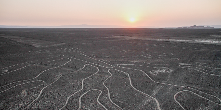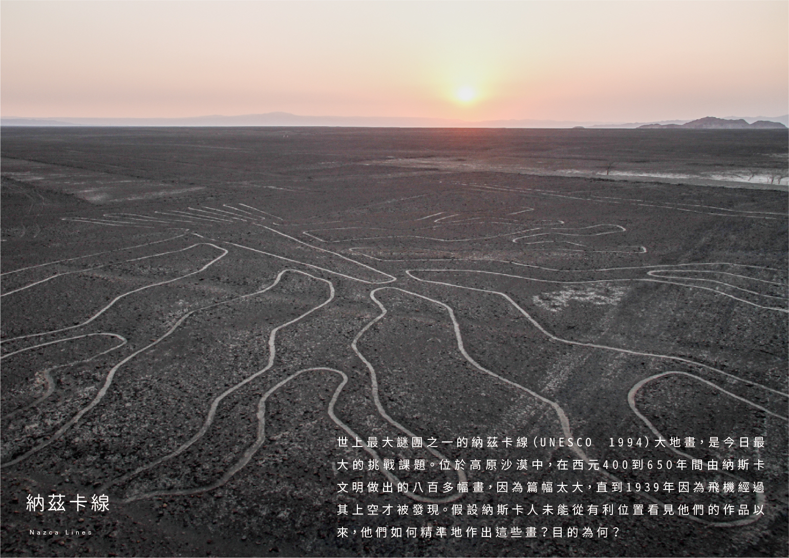 世上最大謎團之一的納茲卡線(UNESCO 1994)大地畫,是今日最大的挑戰課題。位於高原沙漠中,在西元400到650年間由納斯卡文明做出的八百多幅畫,因為篇幅太大,直到1939年因為飛機經過其上空才被發現。假設納斯卡人未能從有利位置看見他們的作品以來,他們如何精準地作出這些畫?目的為何?