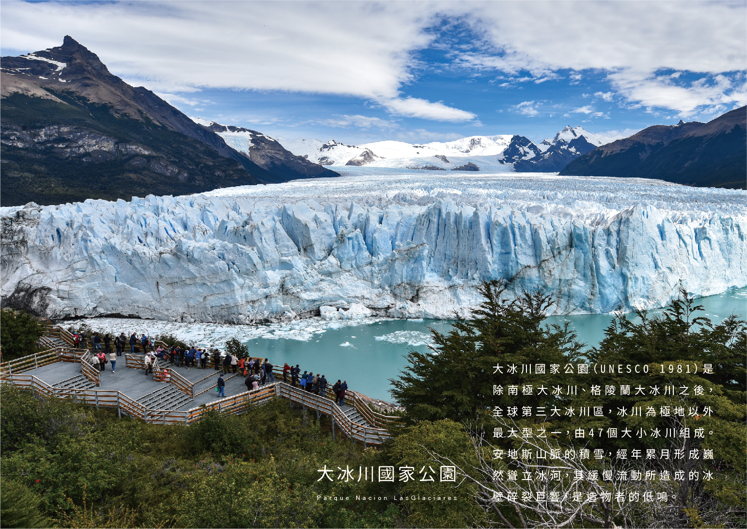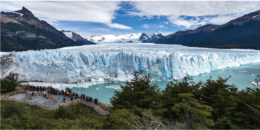 大冰川國家公園(UNESCO 1981)是除南極大冰川、格陵蘭大冰川之後,全球第三大冰川區,冰川為極地以外最大型之一,由47個大小冰川組成。安地斯山脈的積雪,經年累月形成巍然聳立冰河,其緩慢流動所造成的冰壁碎裂巨響,是造物者的低鳴。